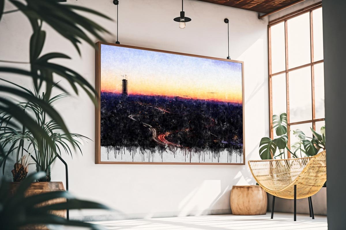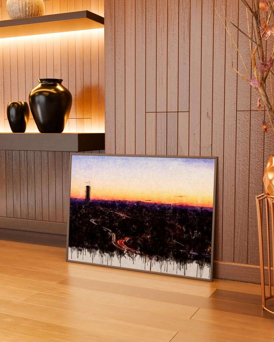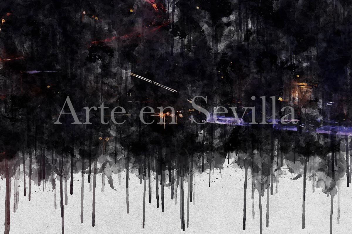 El tratamiento artístico de la obra acentúa su carácter contemporáneo. La textura pictórica y el desvanecido inferior con efecto de goteo refuerzan esa transición entre imagen y materia, entre paisaje real y evocación visual. El resultado es un cuadro con una fuerte carga ambiental, ideal para espacios donde se busca una pieza elegante, moderna y con una conexión sutil pero real con Sevilla.