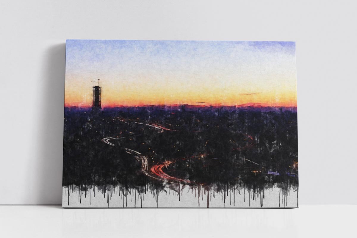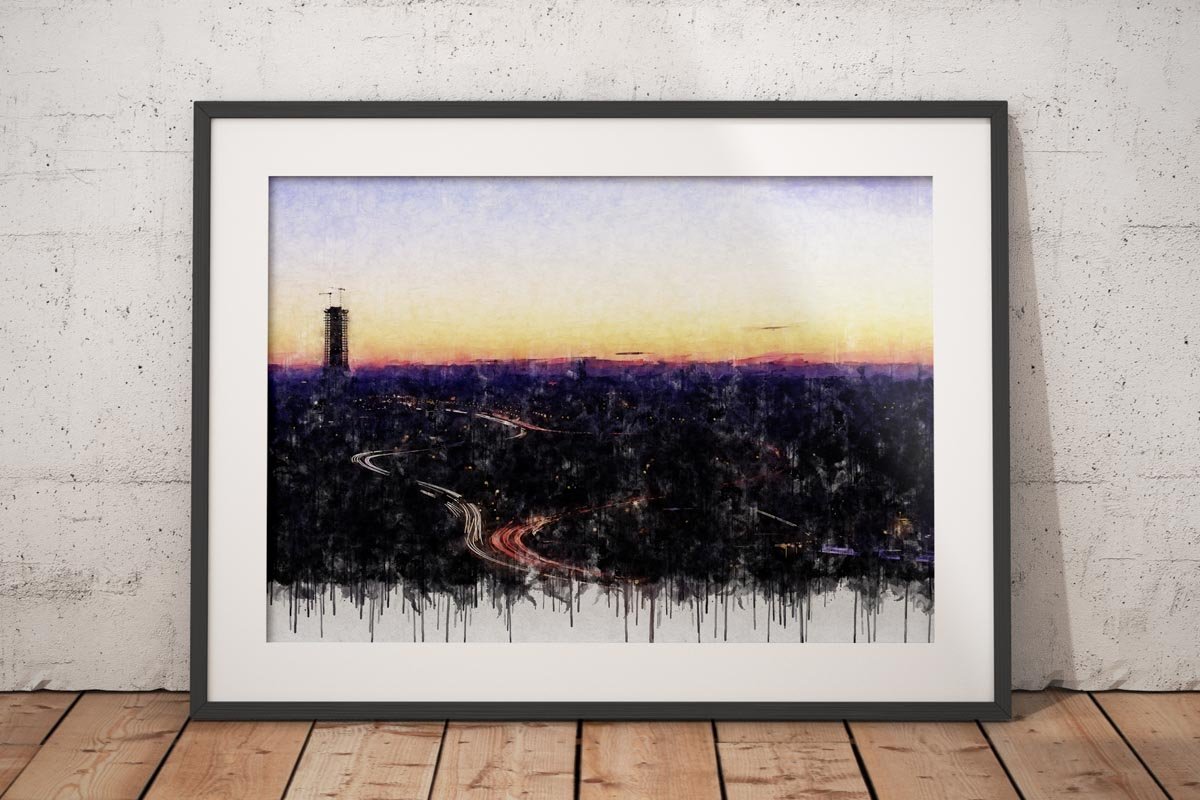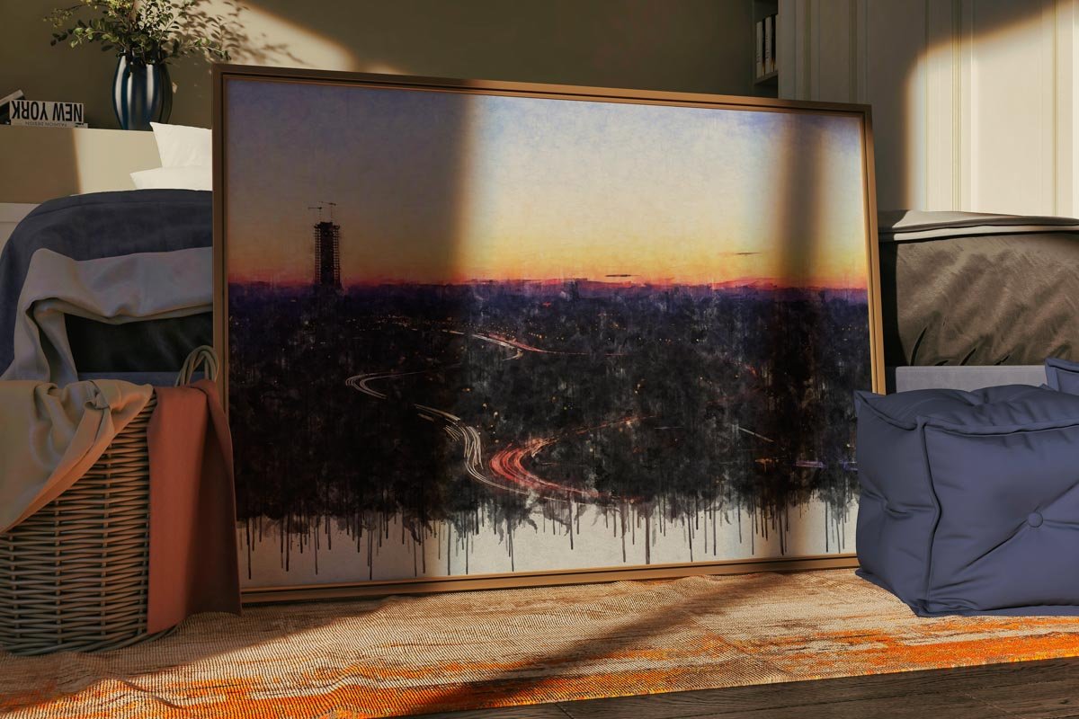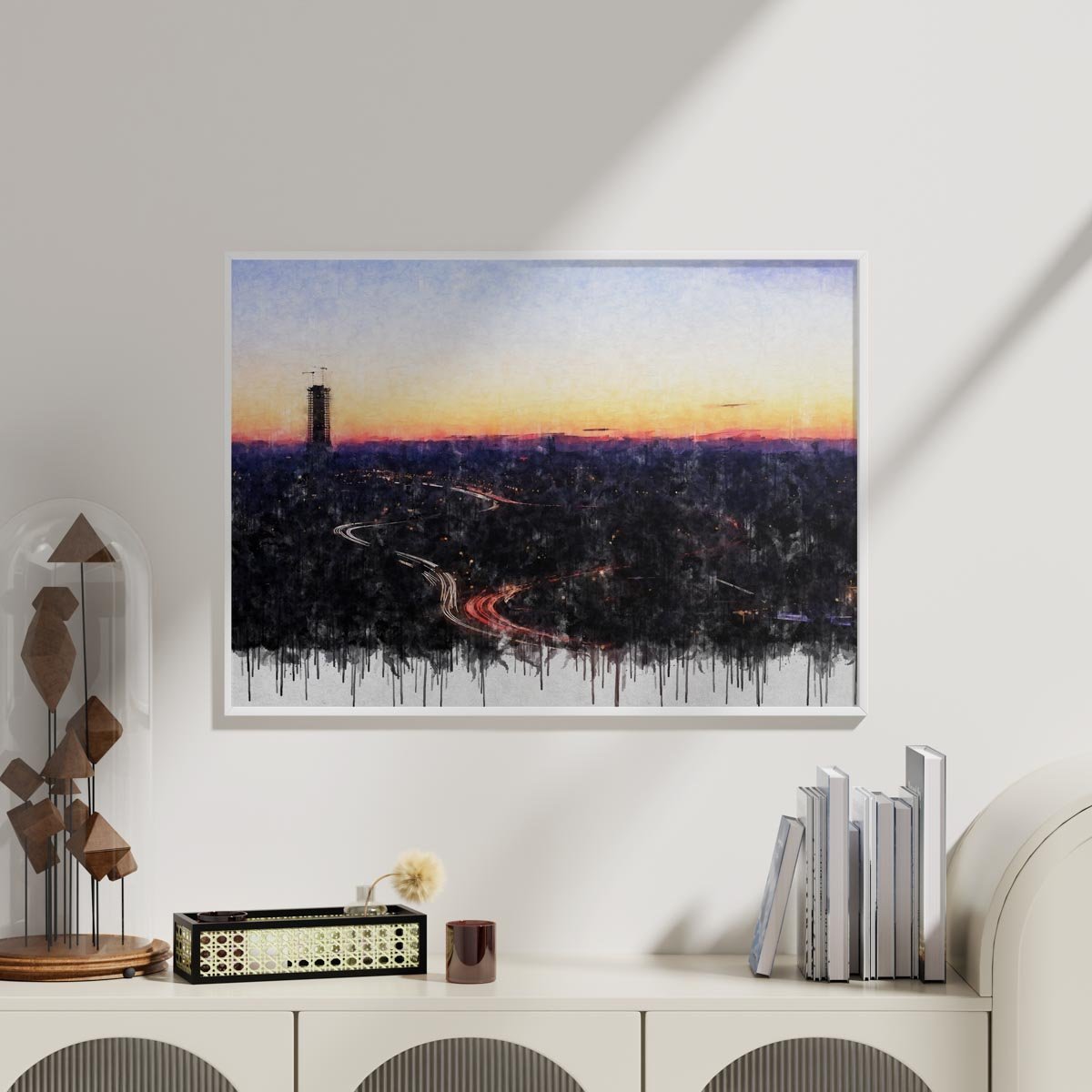 El tratamiento artístico de la obra acentúa su carácter contemporáneo. La textura pictórica y el desvanecido inferior con efecto de goteo refuerzan esa transición entre imagen y materia, entre paisaje real y evocación visual. El resultado es un cuadro con una fuerte carga ambiental, ideal para espacios donde se busca una pieza elegante, moderna y con una conexión sutil pero real con Sevilla.