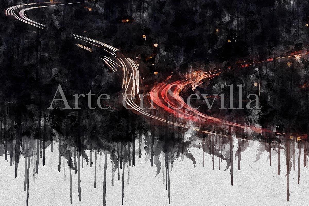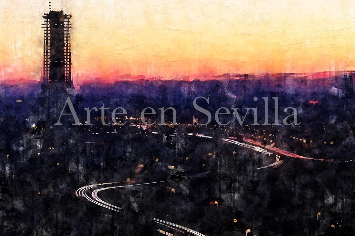 La vista panorámica convierte Sevilla en una presencia lejana, casi silenciosa, más intuida que descrita. No se trata de una imagen monumental ni detallista, sino de una interpretación atmosférica de la ciudad, donde la emoción nace de la luz, de la distancia y de la sensación de inmensidad. Las líneas sinuosas del tráfico introducen ritmo y profundidad, guiando la mirada hacia el fondo y aportando una tensión visual que equilibra la calma general de la escena.