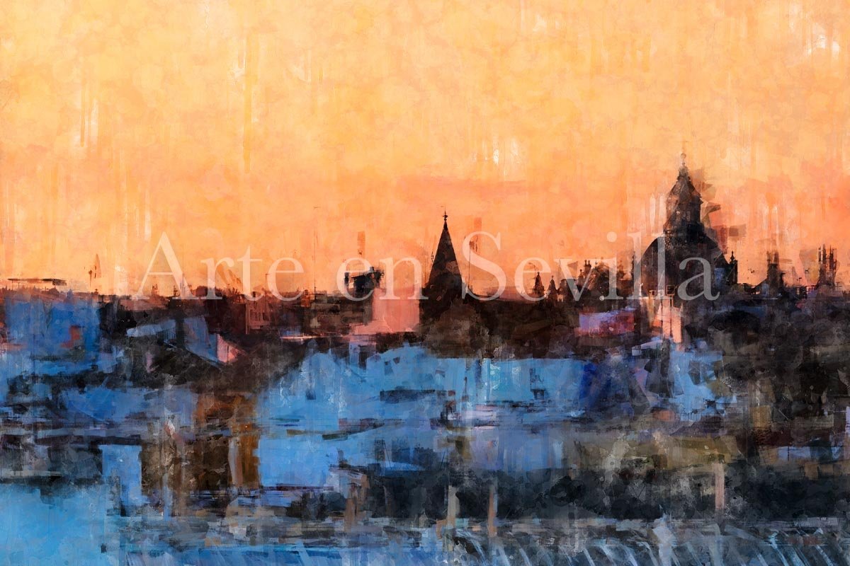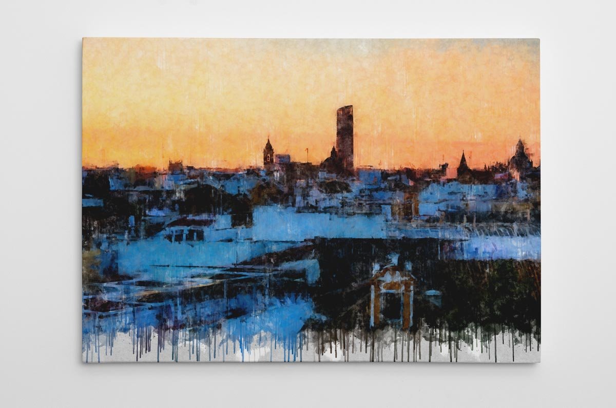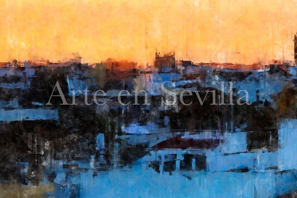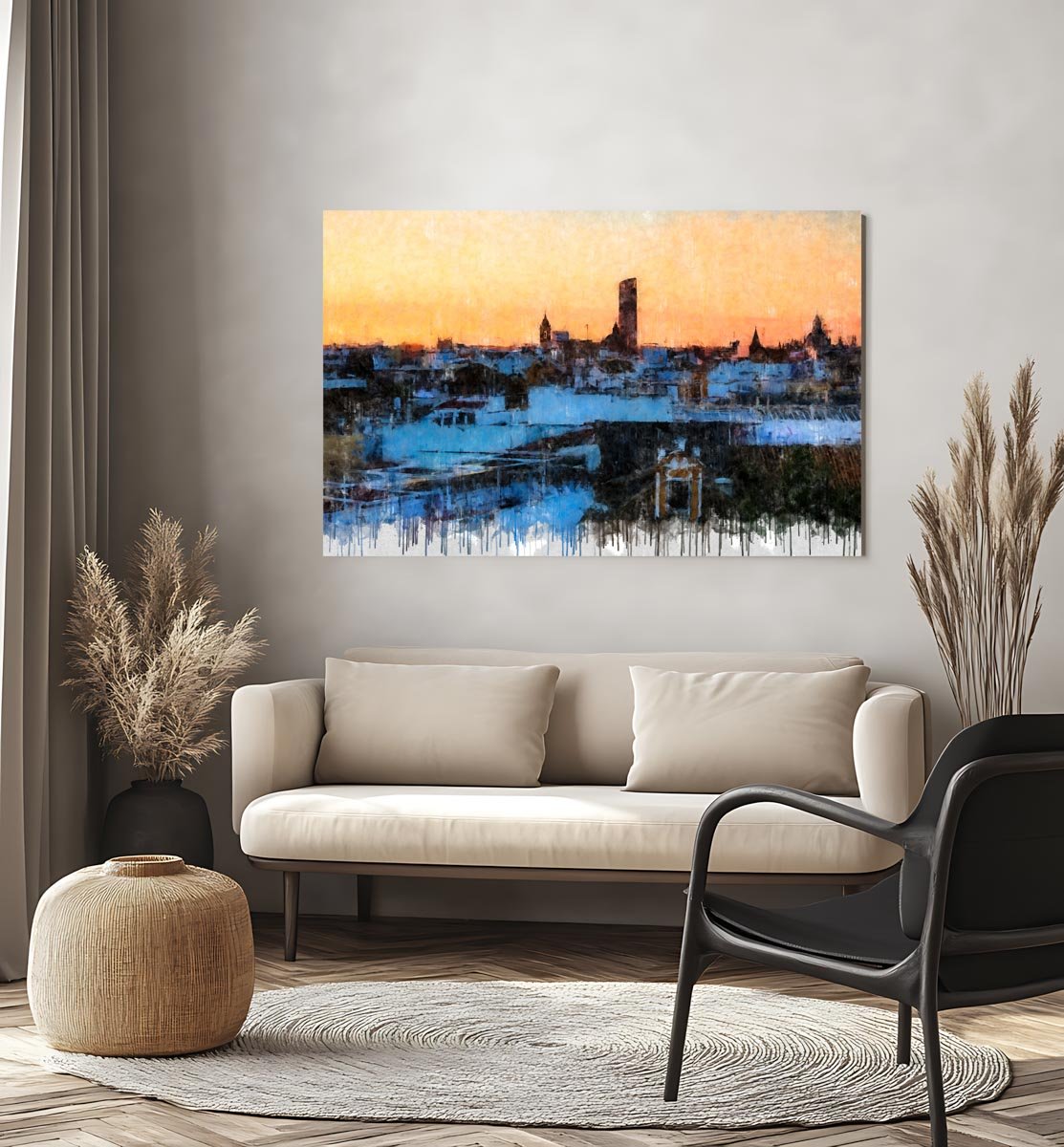 La paleta cromática juega aquí un papel esencial. Los tonos cálidos del cielo se combinan con los azules fríos y las sombras del caserío, generando una tensión visual muy elegante. Como en otros cuadros modernos de Sevilla, la textura pictórica y el desvanecido inferior con efecto de goteo alejan la imagen de lo meramente descriptivo y la convierten en una obra con identidad artística propia.