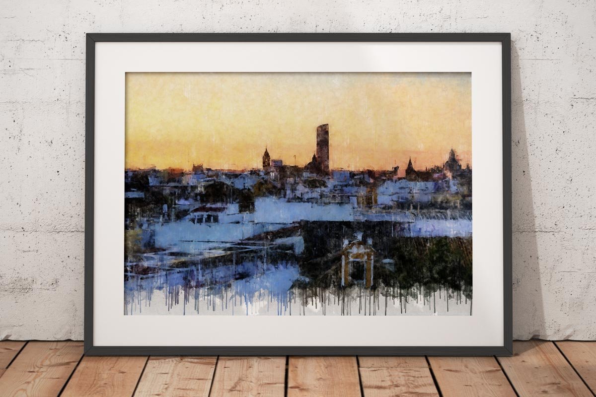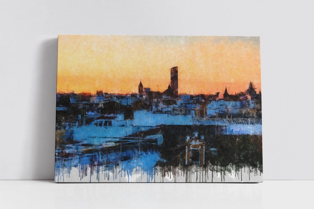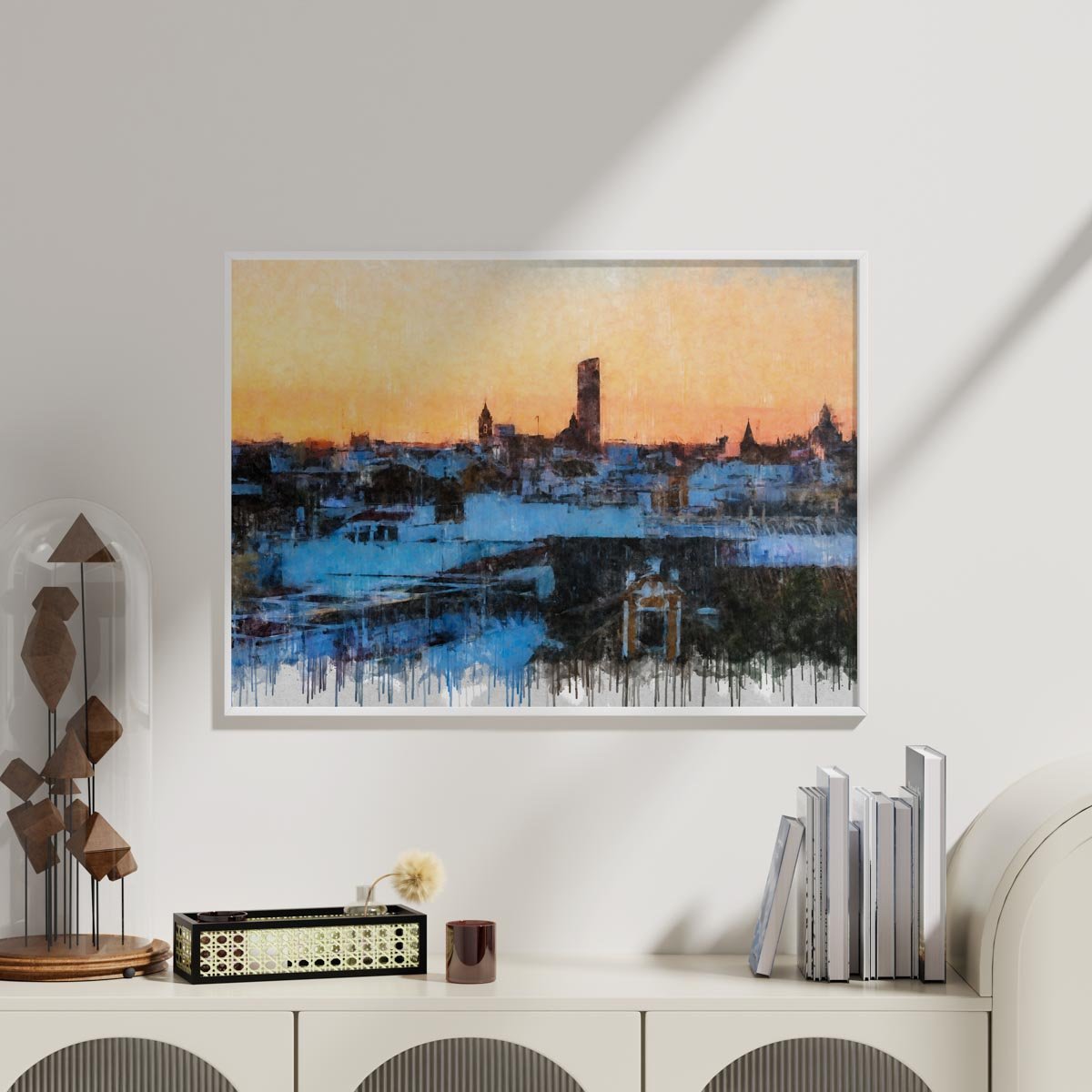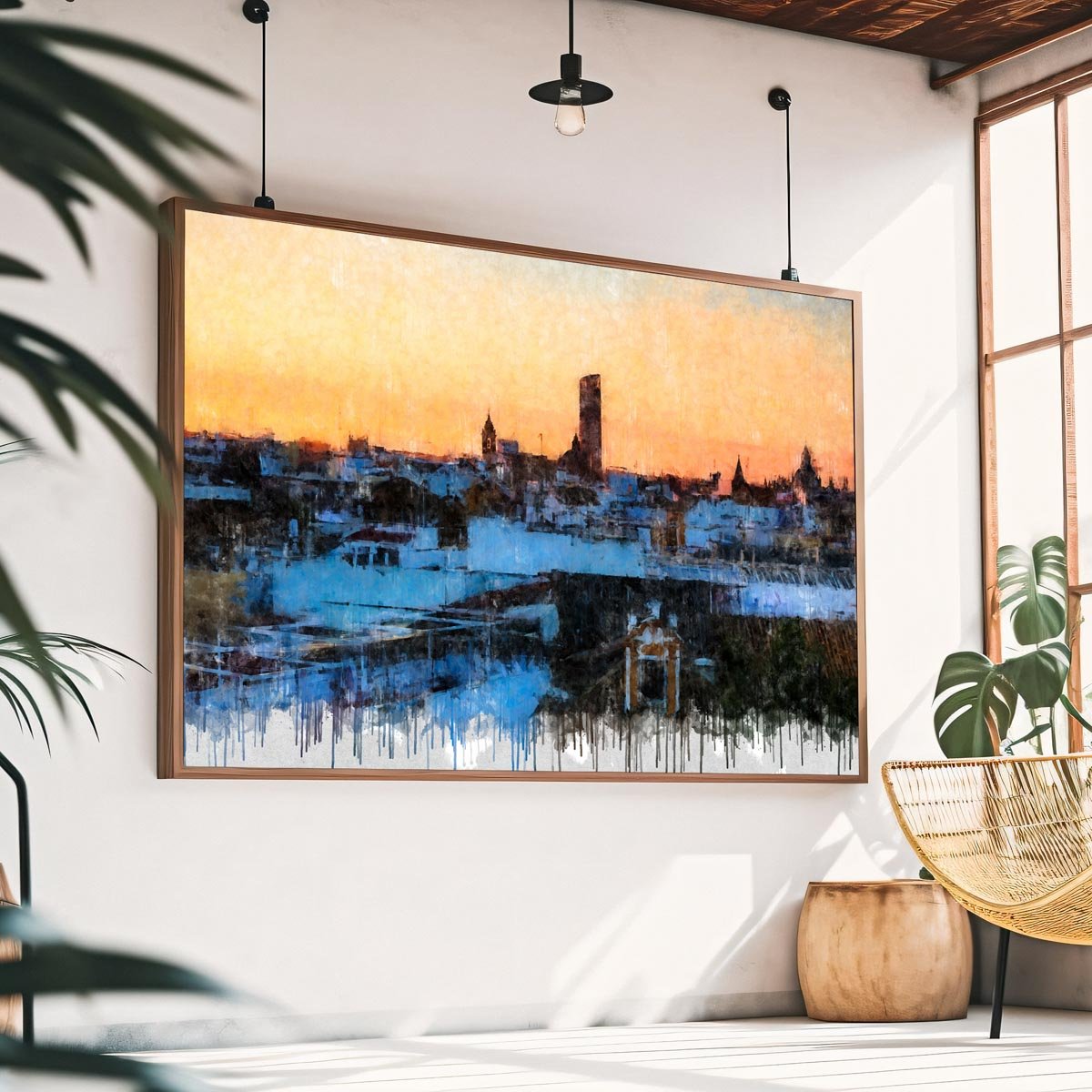 La paleta cromática juega aquí un papel esencial. Los tonos cálidos del cielo se combinan con los azules fríos y las sombras del caserío, generando una tensión visual muy elegante. Como en otros cuadros modernos de Sevilla, la textura pictórica y el desvanecido inferior con efecto de goteo alejan la imagen de lo meramente descriptivo y la convierten en una obra con identidad artística propia.