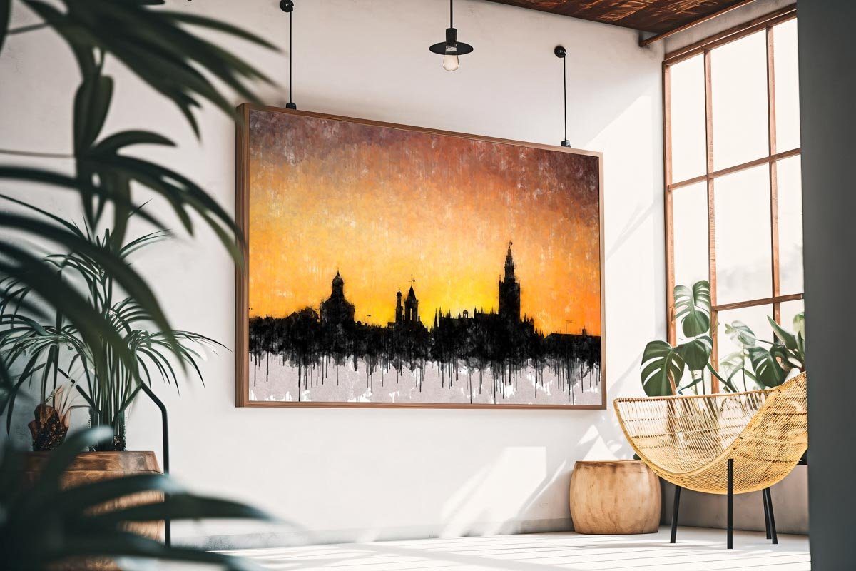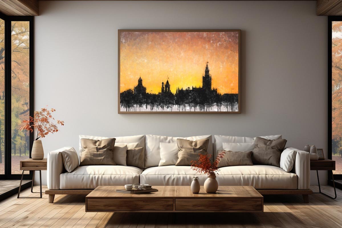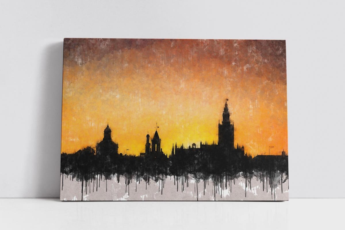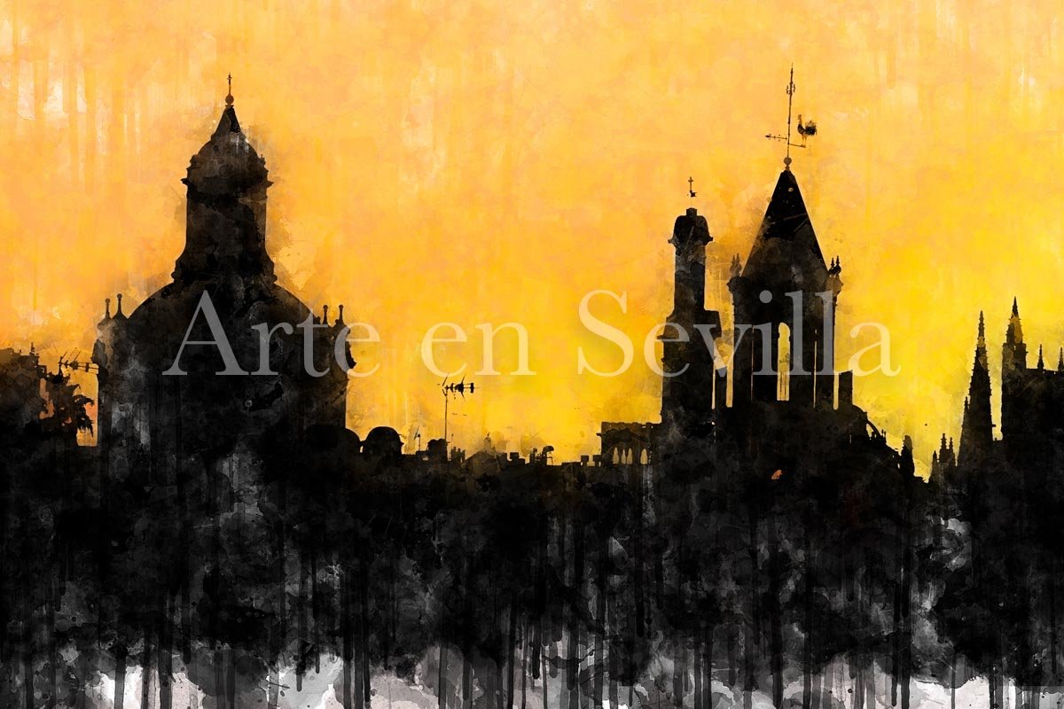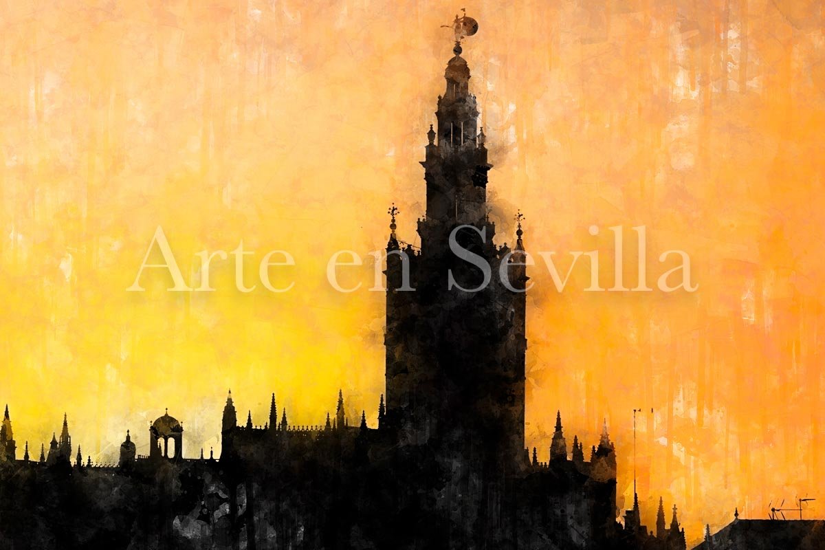 Atardecer dorado en Sevilla es uno de esos cuadros modernos de Sevilla que condensan la identidad visual de la ciudad en una imagen sencilla, poderosa y llena de atmósfera. La obra presenta el perfil monumental de Sevilla como una gran silueta oscura que se recorta sobre un cielo encendido en tonos dorados, ocres y anaranjados, convirtiendo el horizonte en el verdadero protagonista de la composición.
