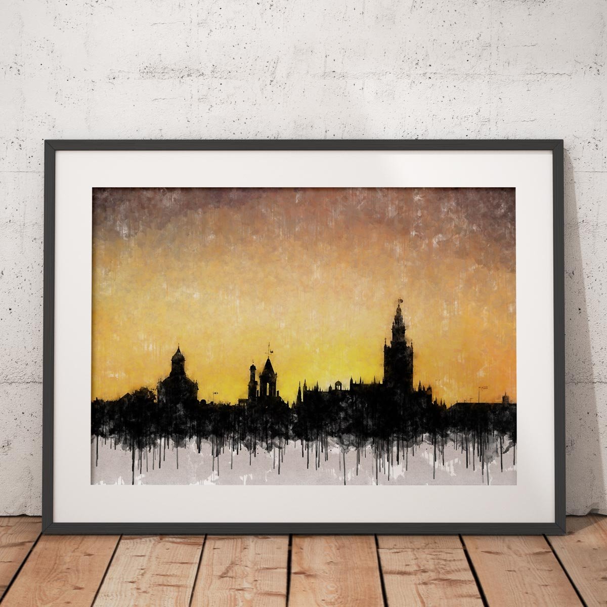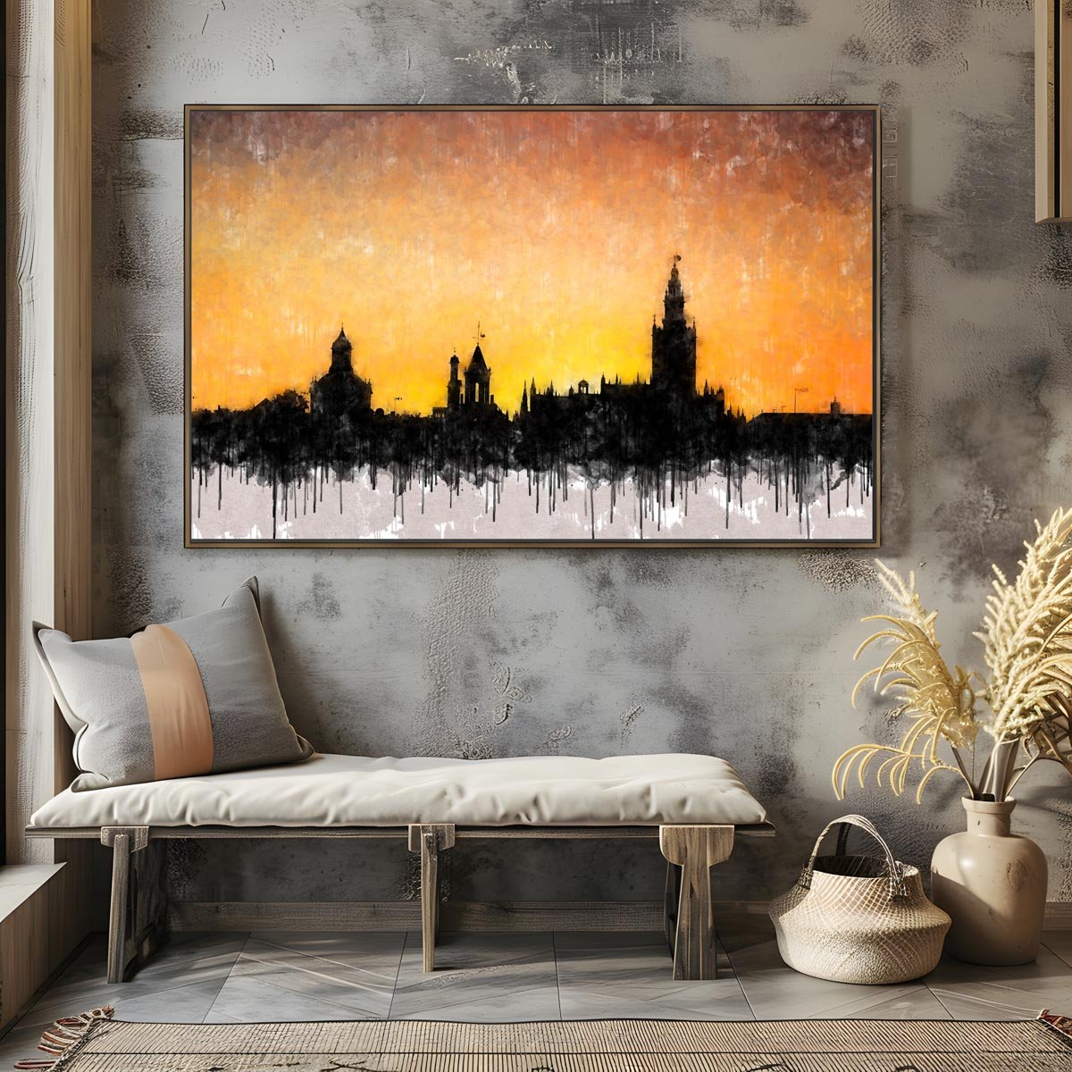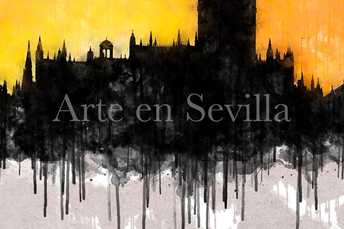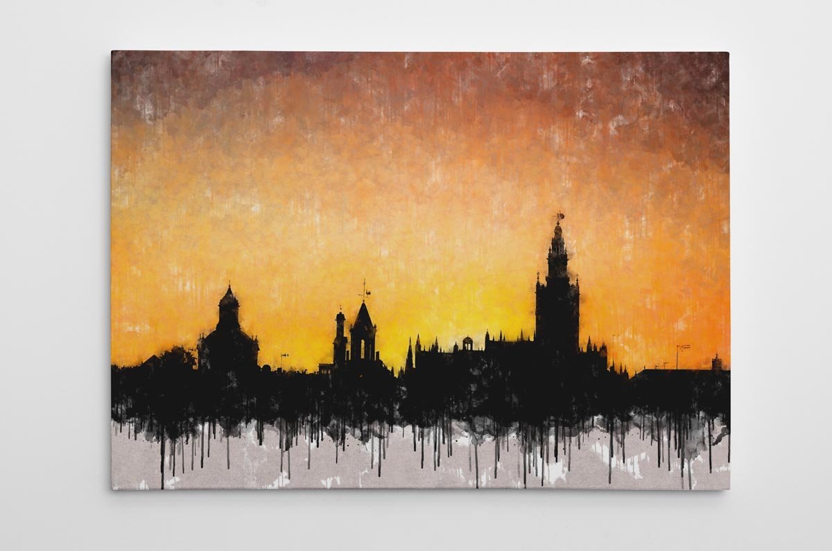 La textura pictórica y el desvanecido inferior con efecto de goteo integran plenamente la obra en el lenguaje visual de la serie. Como ocurre en otros cuadros modernos de Sevilla, el resultado se mueve entre lo urbano y lo pictórico, entre la silueta real y la evocación artística. Ese tratamiento hace que la obra funcione especialmente bien en espacios donde se quiera incorporar una pieza elegante, con contraste visual y una conexión muy clara con Sevilla.