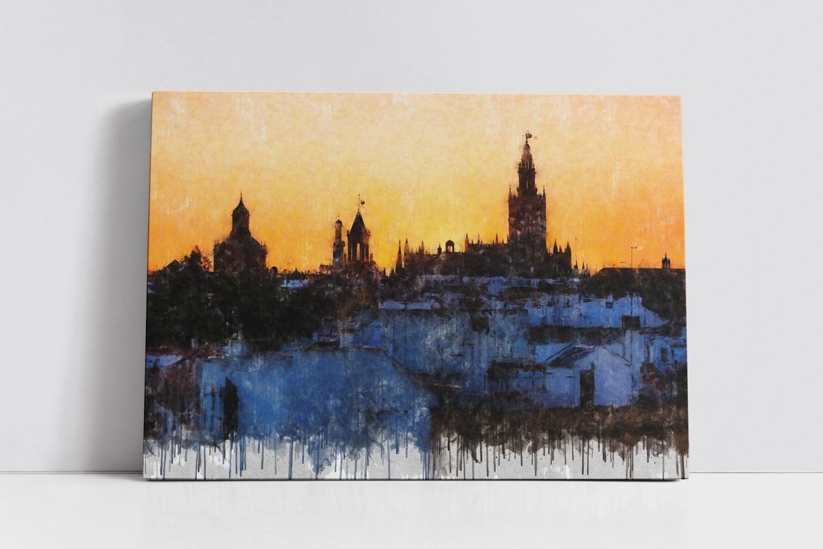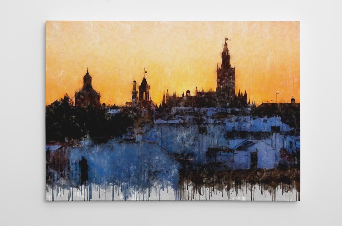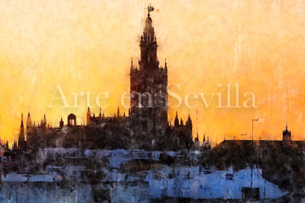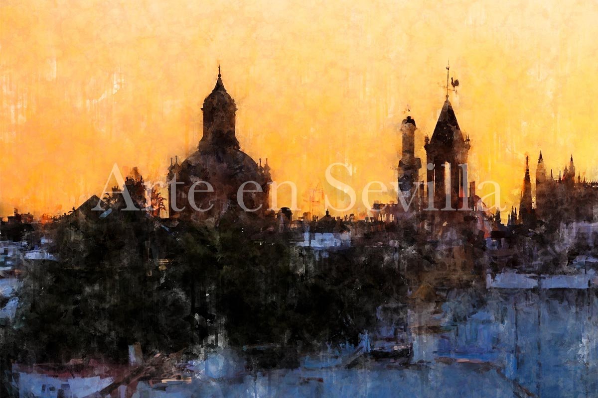 La luz del atardecer envuelve toda la escena en una gama de dorados, ocres y anaranjados que aportan calidez y unidad. Como en otros cuadros modernos de Sevilla, la textura pictórica y el desvanecido inferior con efecto de goteo refuerzan la dimensión artística de la obra y la alejan de cualquier lectura meramente descriptiva. El resultado es una pieza elegante, atmosférica y profundamente conectada con la identidad visual de Sevilla.