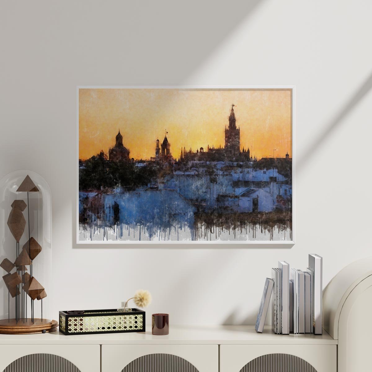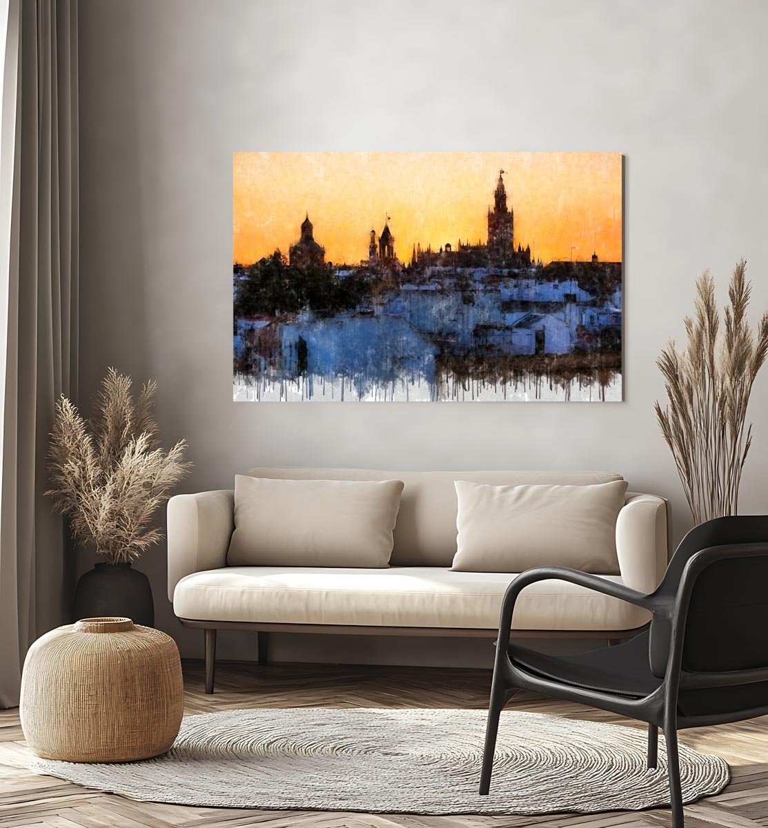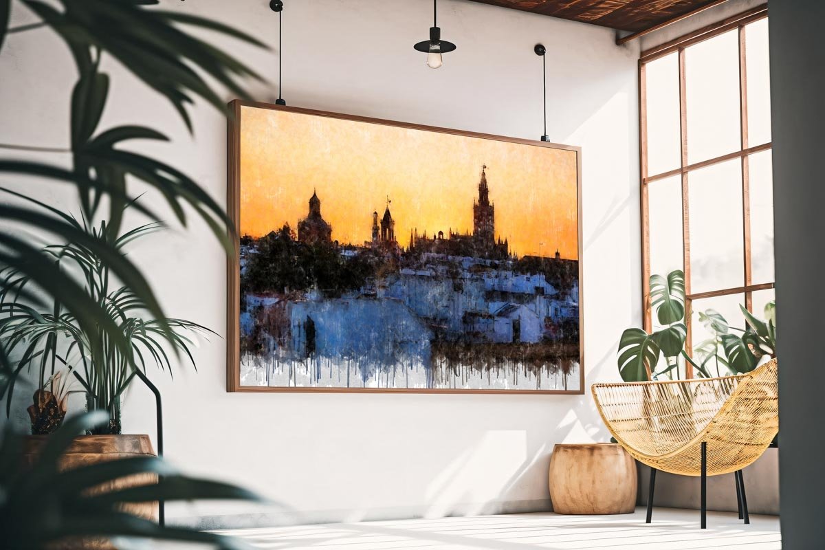 Azoteas de Sevilla es ideal para quienes buscan cuadros modernos de Sevilla con un equilibrio entre arquitectura histórica, paisaje urbano y emoción. Funciona especialmente bien en salones, despachos o interiores donde se quiera incorporar una obra con calidez visual, profundidad y una imagen auténtica de la ciudad.