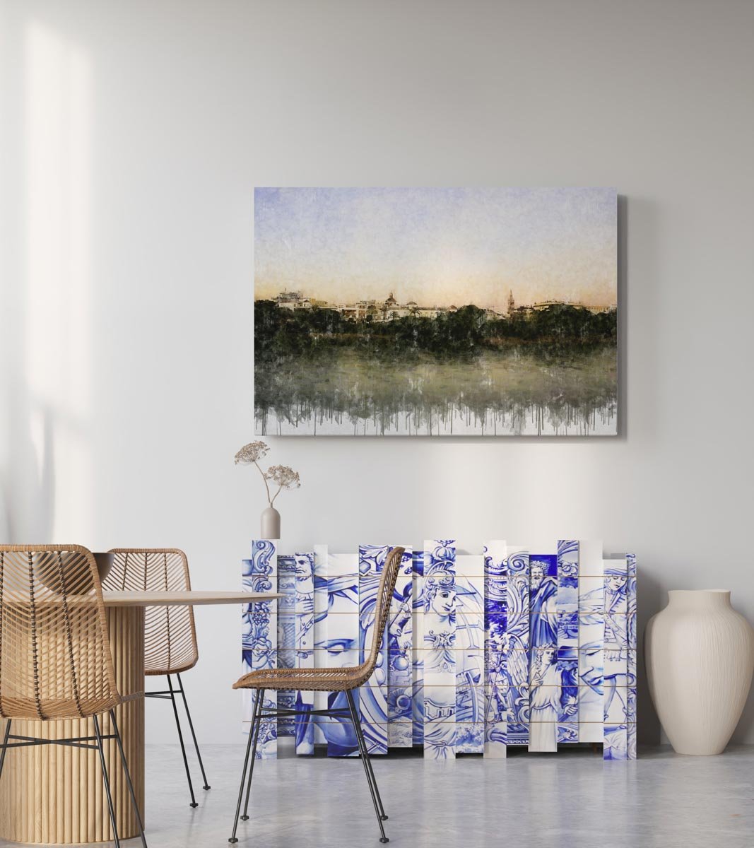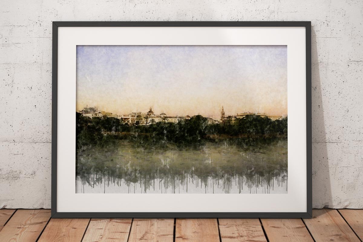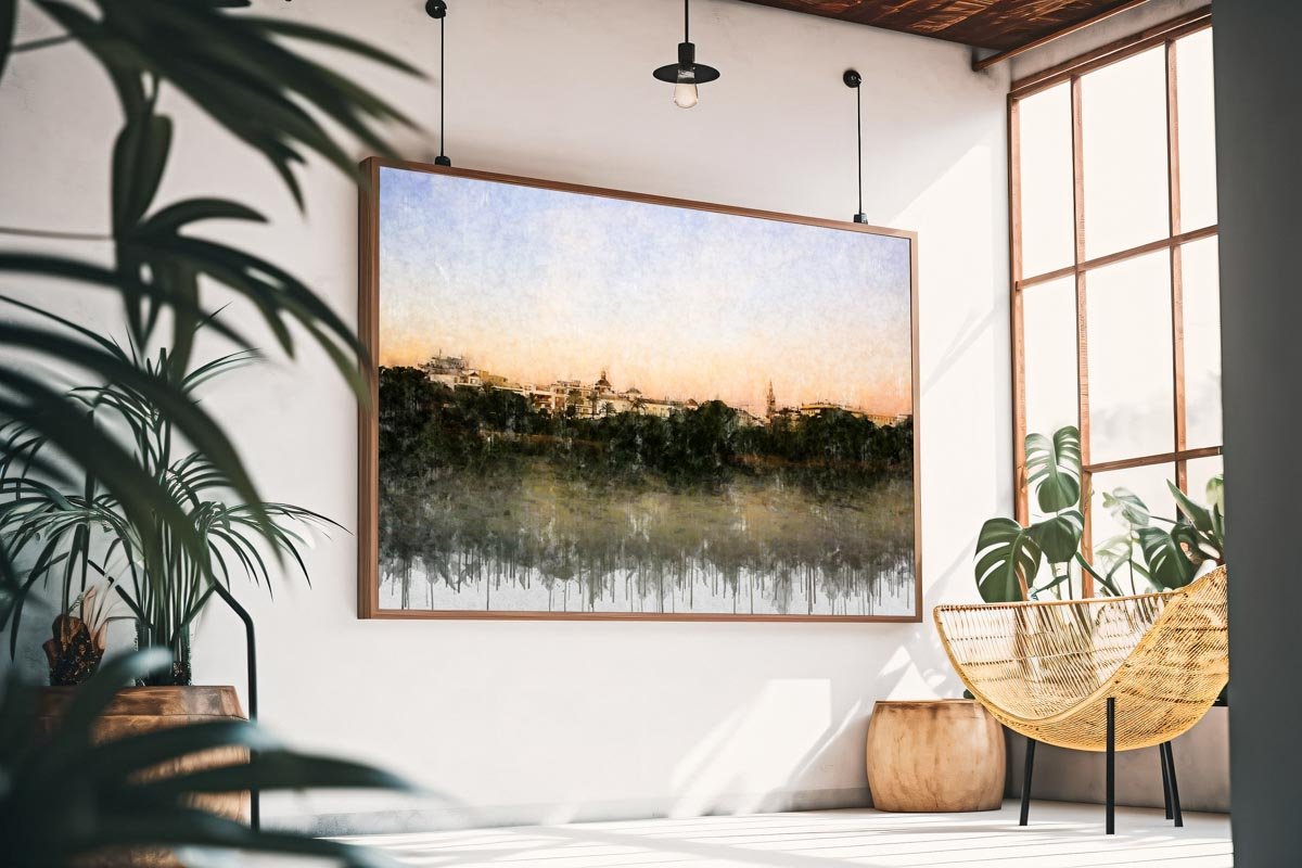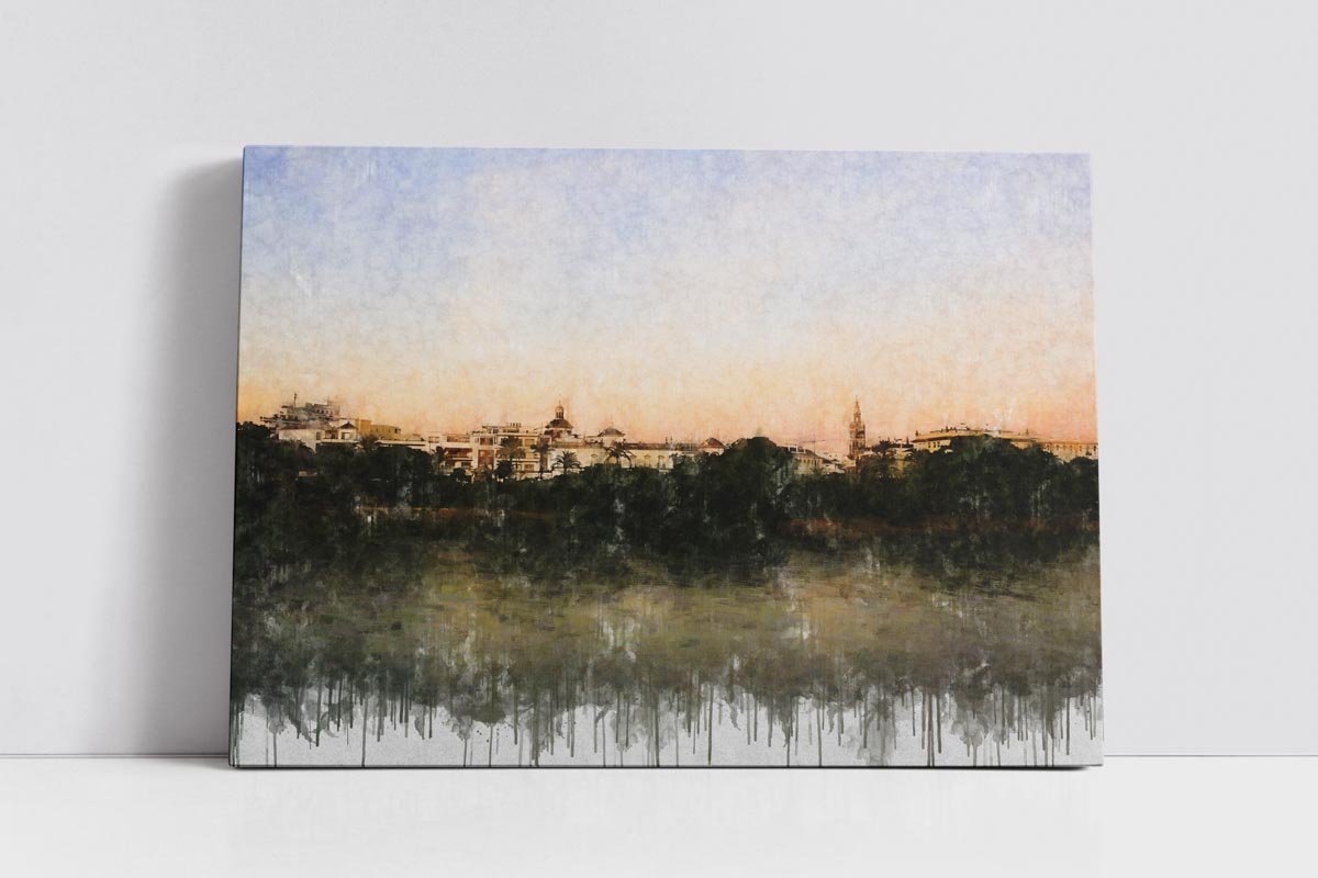 Cuadro impresión digital en tela de lienzo. Entre nuestros cuadros modernos de Sevilla, esta obra ofrece una mirada serena de la ciudad desde la otra orilla, con el caserío recortado al fondo y el río convertido en espacio de calma, reflejo y distancia.