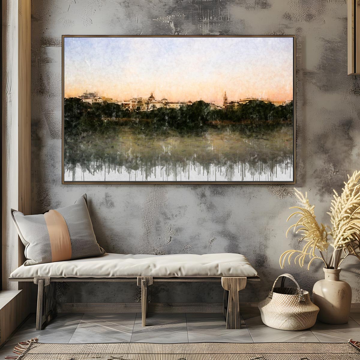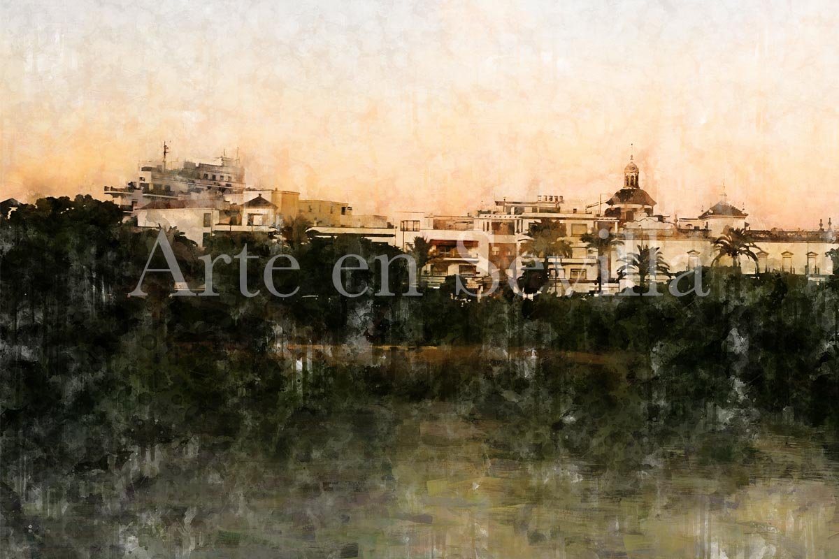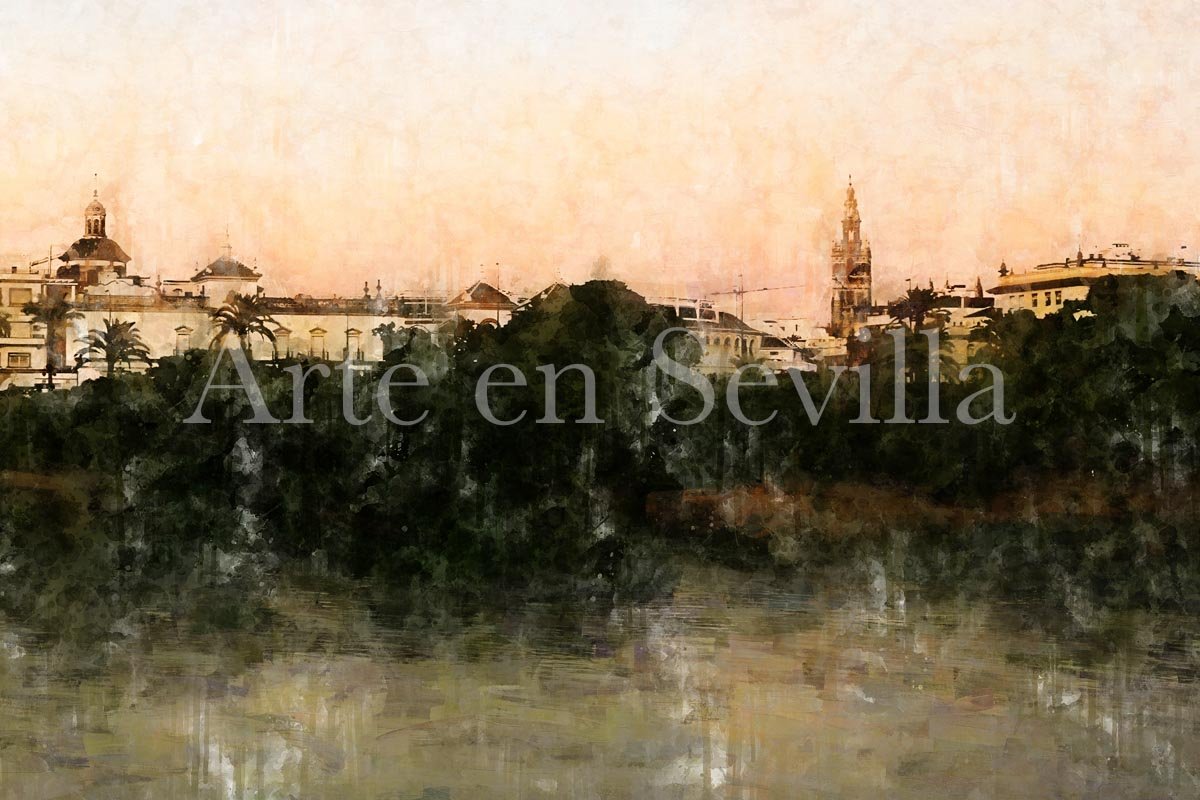 La paleta suave, dominada por tonos claros, tierras delicadas y matices verdosos y grisáceos en el agua, aporta a la obra una sensación de ligereza muy refinada. Como en otros cuadros modernos de Sevilla, la textura pictórica y el desvanecido inferior con efecto de goteo refuerzan el carácter artístico de la imagen y la sitúan entre la evocación visual y el paisaje emocional.