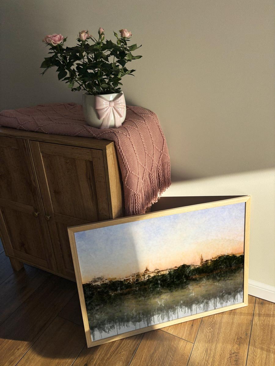 Lo que da personalidad a este cuadro moderno de Sevilla es su contención. No busca el impacto monumental ni el protagonismo de un único icono, sino la armonía del conjunto: la línea del caserío, las cúpulas y torres que emergen en el horizonte, la masa oscura de la ribera y el agua en primer término, tratada como una superficie serena que absorbe la luz y extiende la sensación de calma por toda la composición.