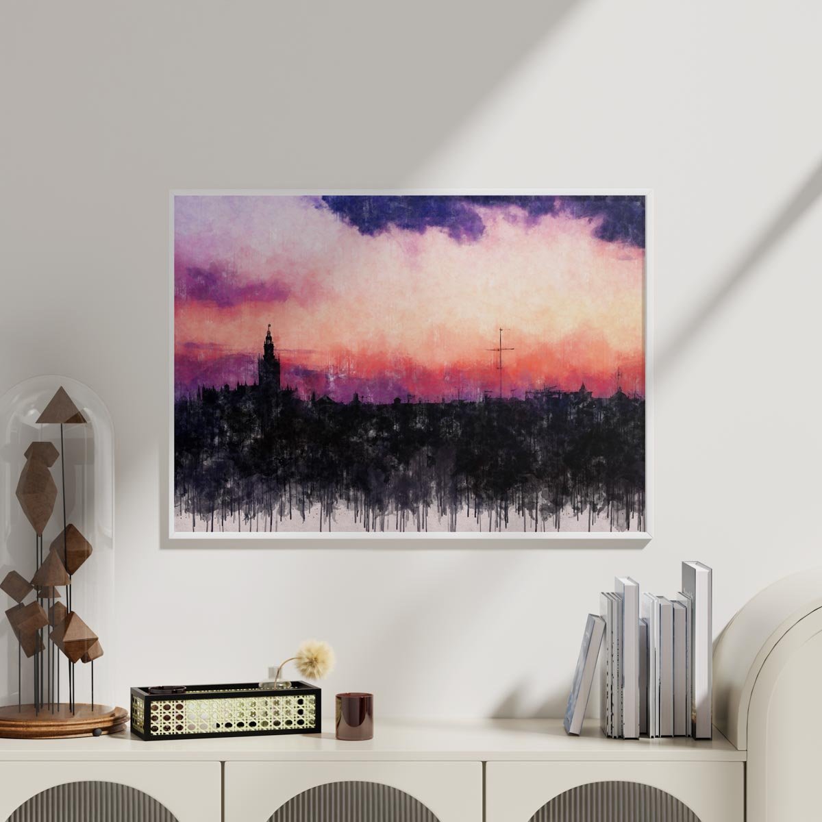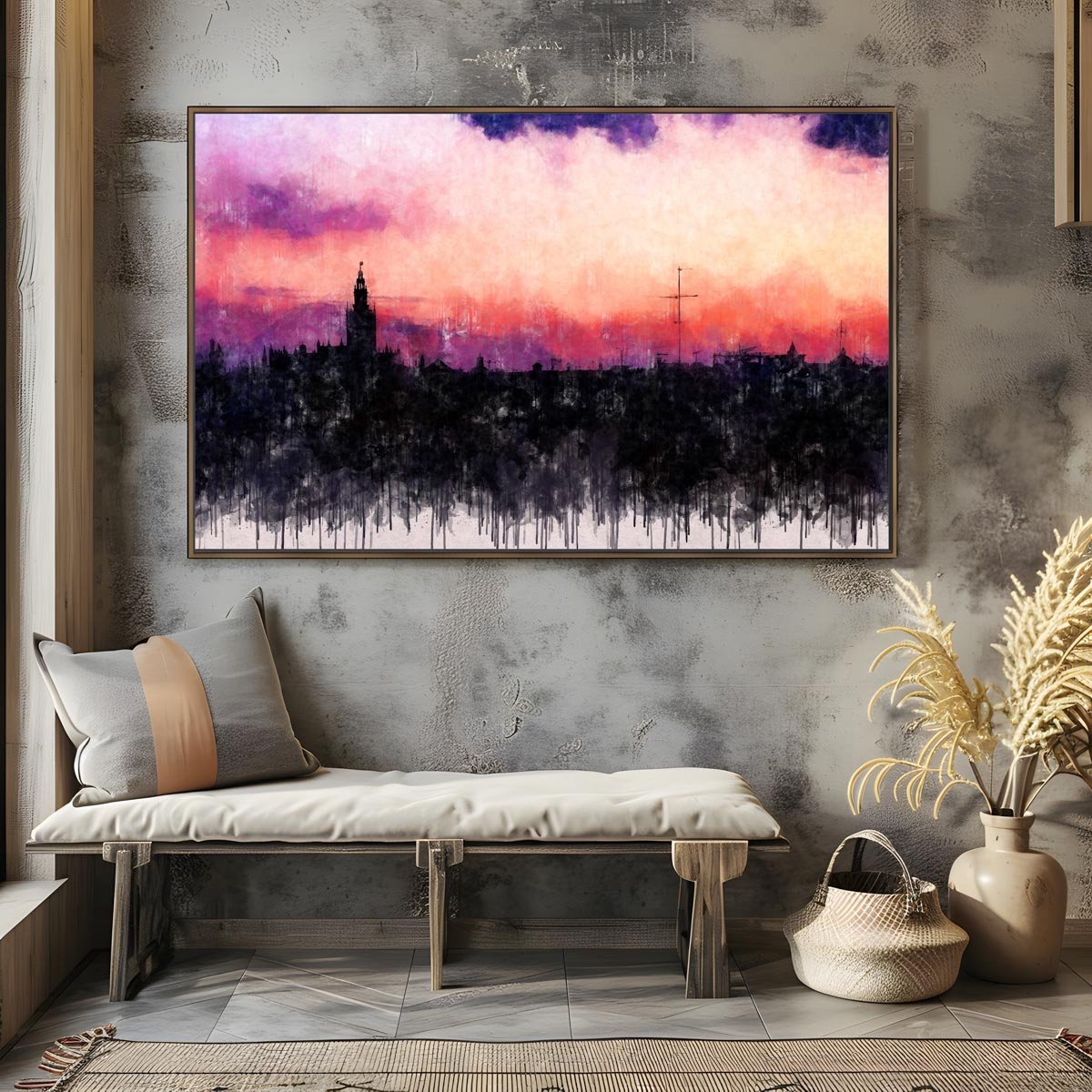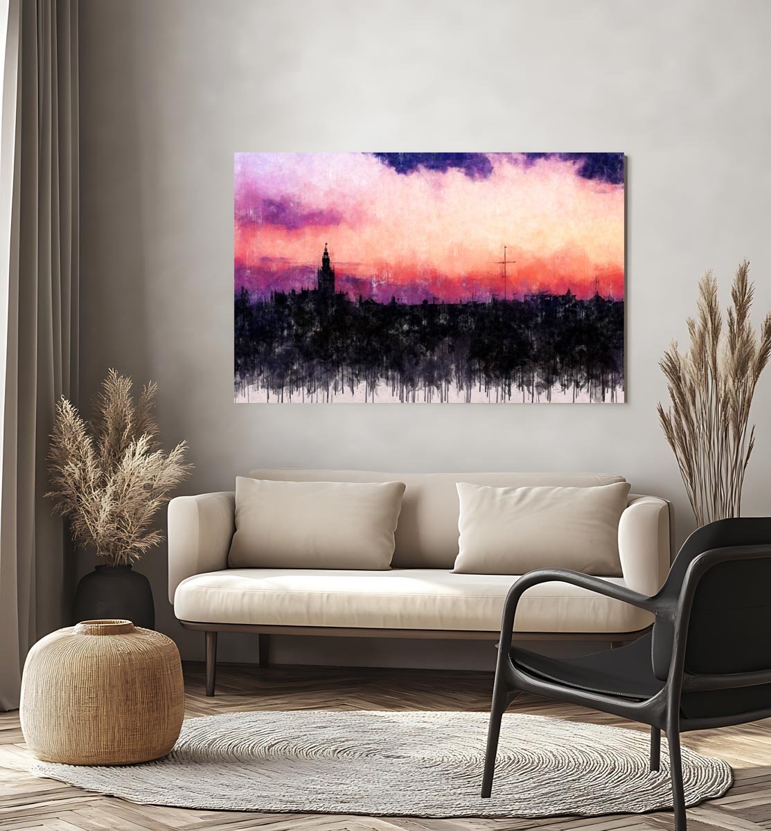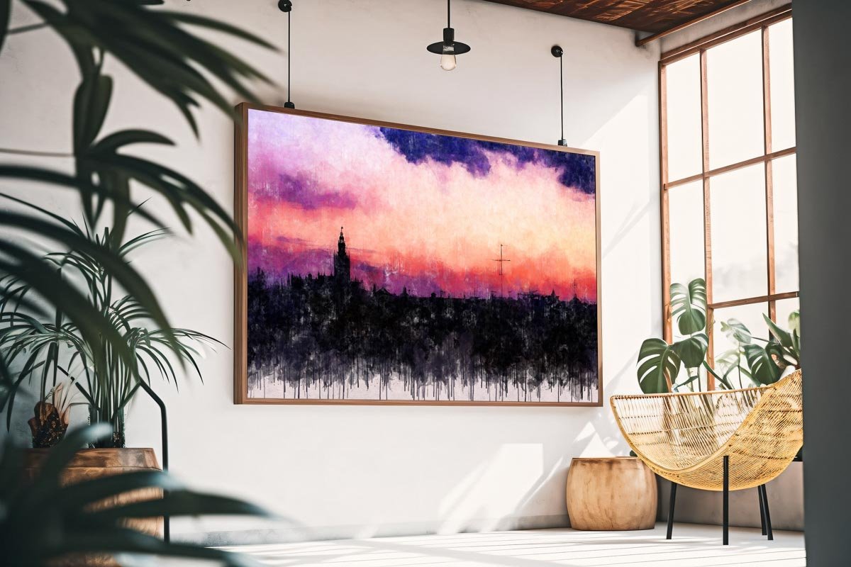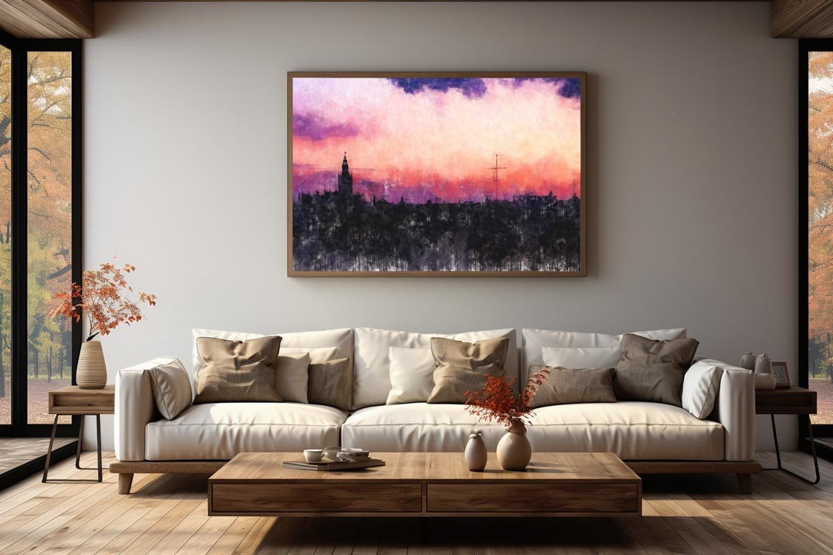 La fuerza cromática del cielo, dominado por tonos rosados, púrpuras y azulados, contrasta con la masa oscura de la ciudad y aporta a la composición una intensidad visual muy marcada. Esa combinación de color y silencio crea una presencia elegante, delicada y llena de personalidad, capaz de transformar por completo la atmósfera de un espacio.