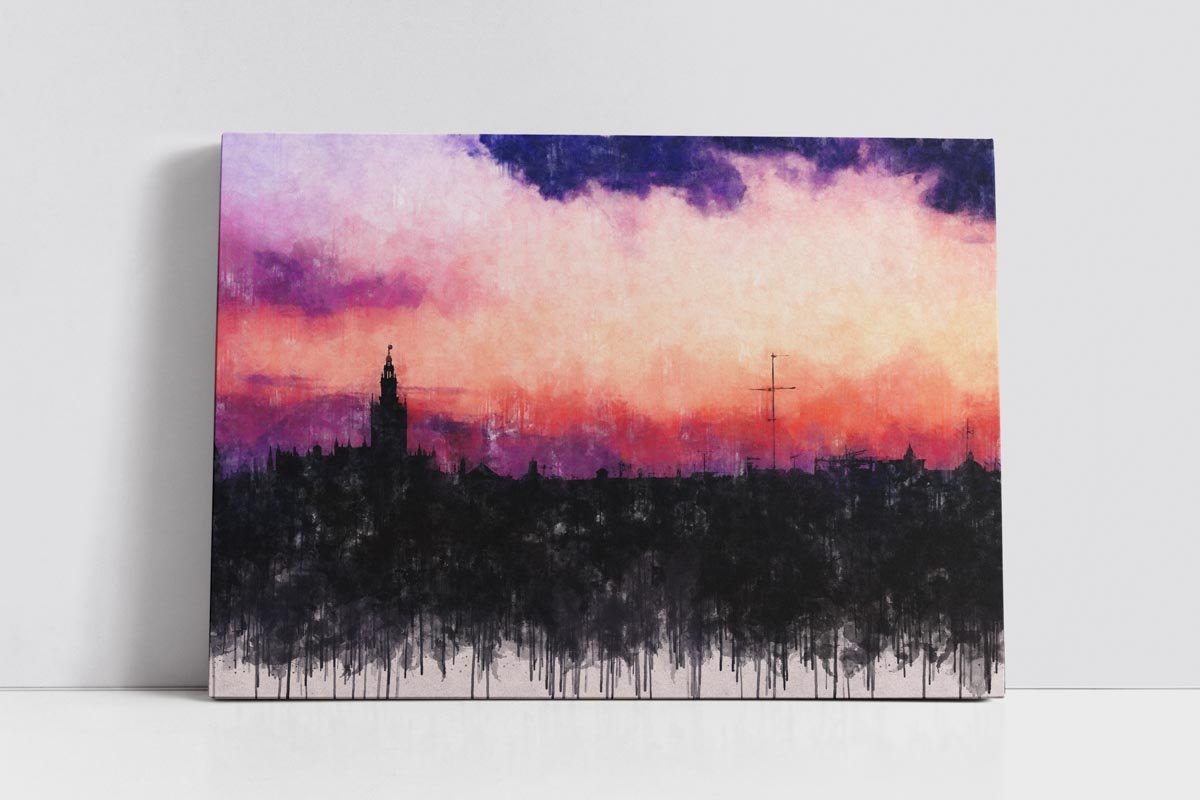 Cuadro moderno de Sevilla en lienzo, listo para colgar. Una interpretación contemporánea del horizonte sevillano y la Giralda bajo un cielo lleno de matices, ideal para decorar hogares, despachos o pisos turísticos con color, emoción y esencia sevillana.