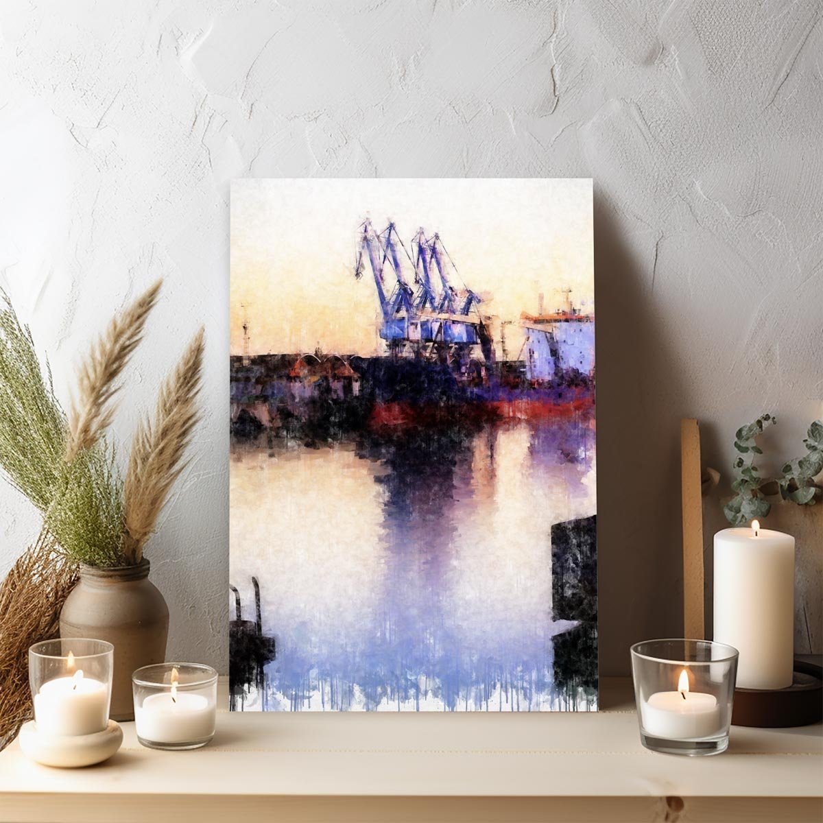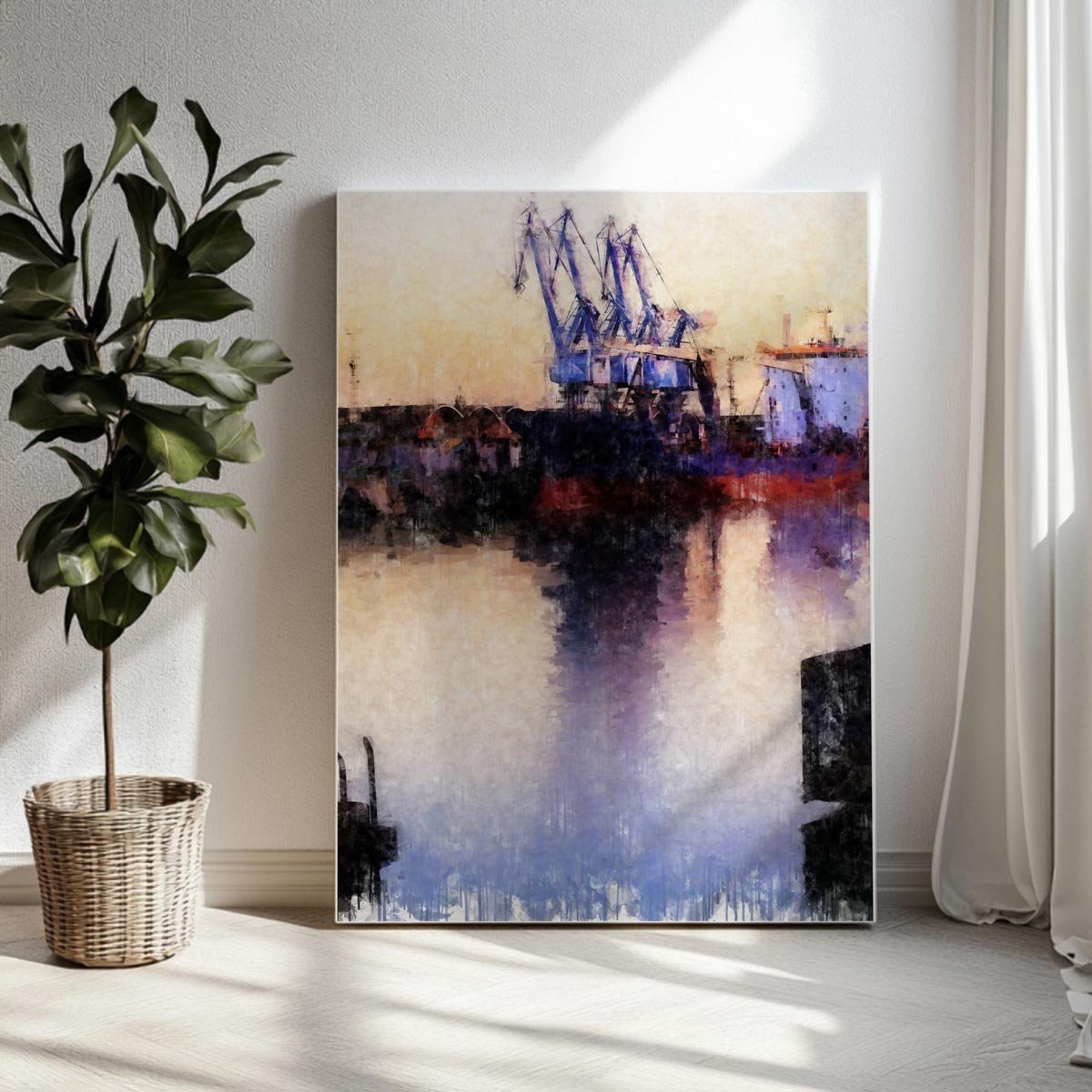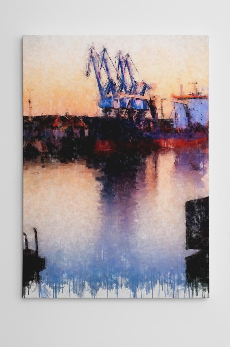 Uno de los rasgos más interesantes de esta pieza es su capacidad para transformar un entorno industrial en una imagen delicada, elegante y profundamente pictórica. Las estructuras del puerto aparecen tratadas con suavidad, casi envueltas por la atmósfera, mientras el agua recoge sus formas y los tonos del cielo, prolongando visualmente la escena y reforzando su sensación de calma. Esa combinación entre líneas técnicas y tratamiento sensible convierte la obra en una de las piezas más singulares dentro de la colección de cuadros modernos de Sevilla.