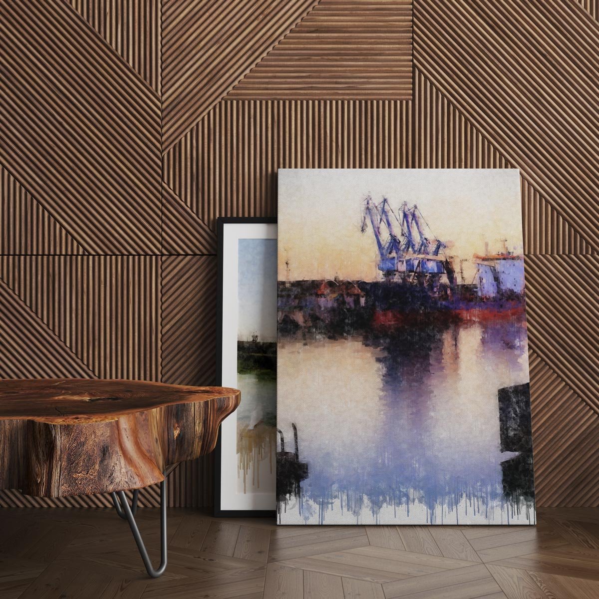 La textura pictórica acentúa el valor artístico de la imagen y evita una representación meramente descriptiva del paisaje industrial. Como en otras piezas de la colección, el acabado inferior con efecto de goteo introduce un lenguaje visual actual que añade personalidad y conecta la escena con una estética moderna sin perder armonía.