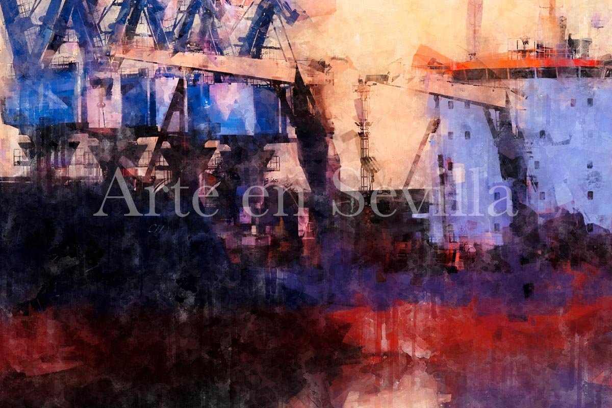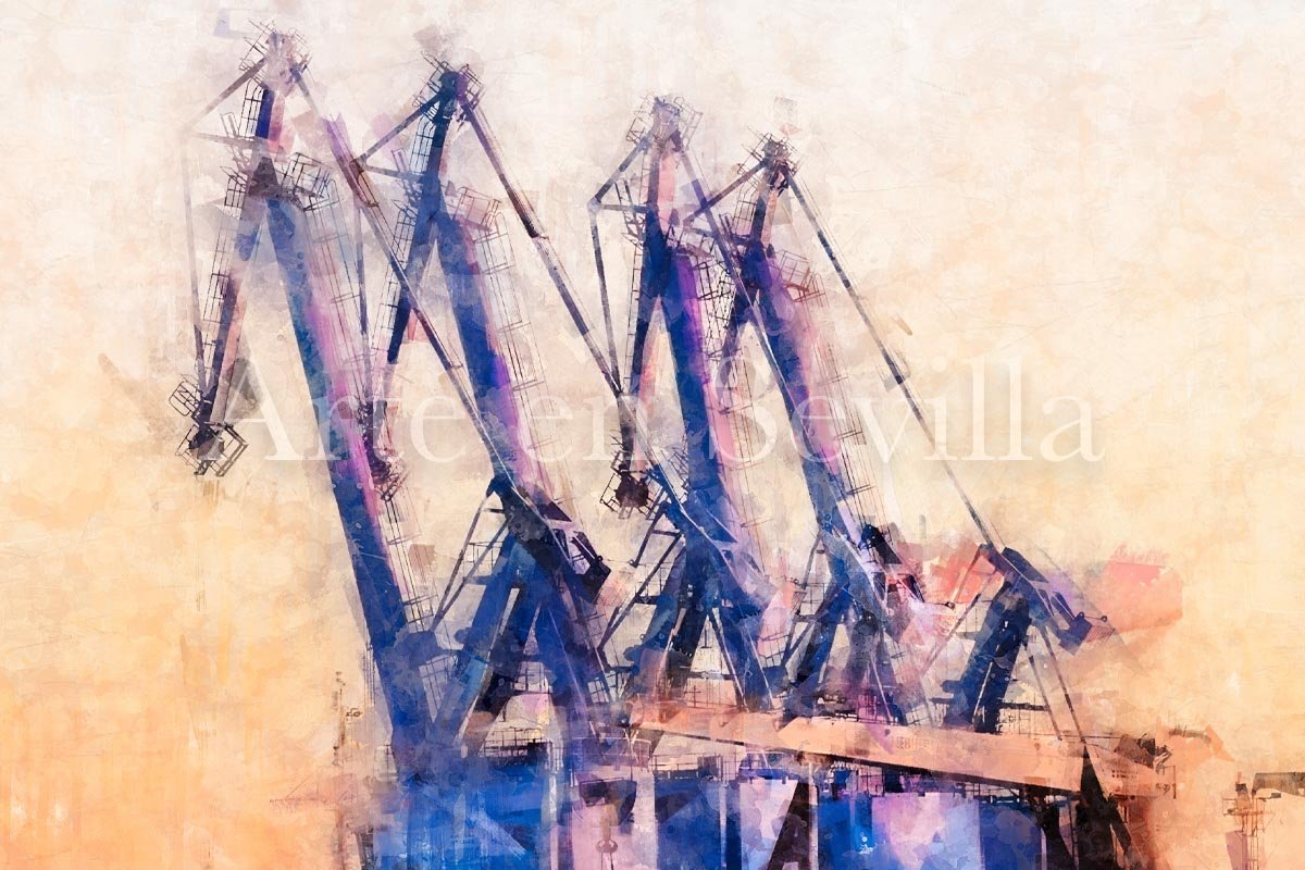 Grúas del Puerto de Sevilla es un cuadro moderno de Sevilla que revela una faceta menos habitual de la ciudad, pero visualmente muy atractiva: su paisaje portuario. La obra se centra en las grúas que se elevan sobre la lámina de agua, definiendo una composición vertical, abierta y silenciosa en la que la luz y el reflejo adquieren un papel protagonista.