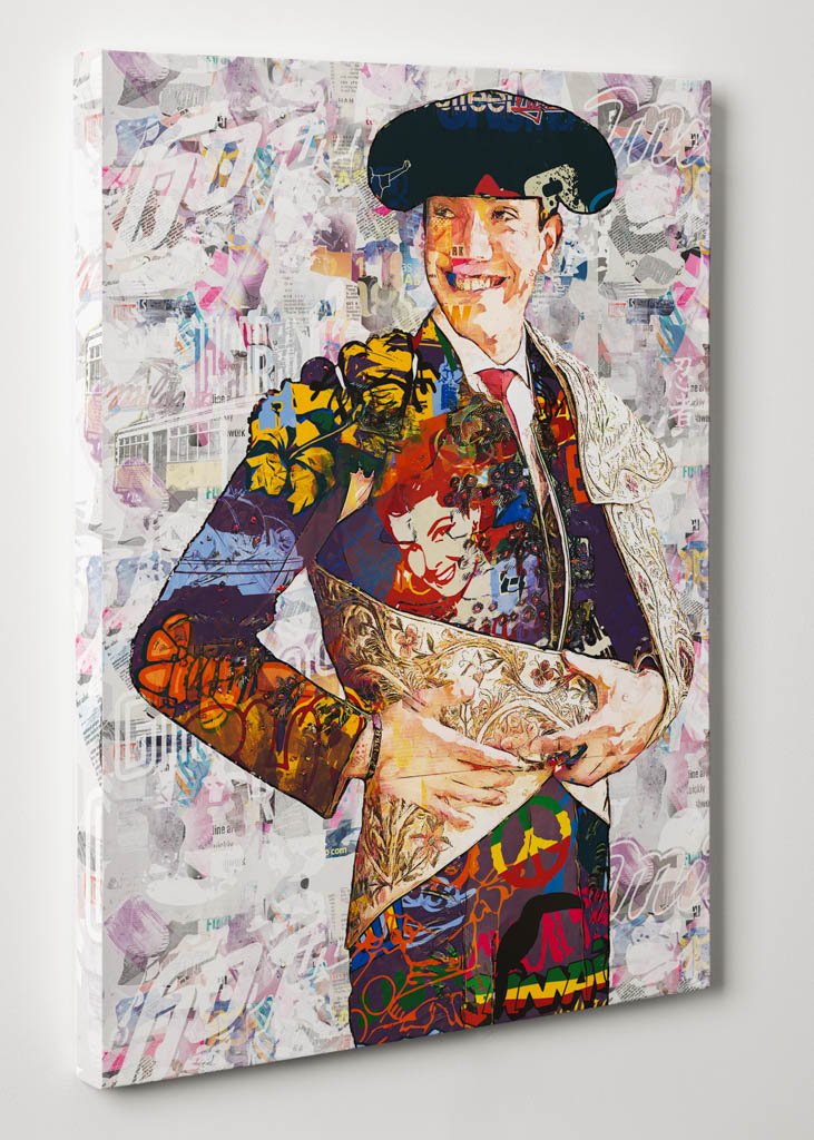 Luz y torería es un cuadro moderno de toreros que transforma la figura del matador en una imagen luminosa, elegante y llena de personalidad. La obra presenta un retrato de gran fuerza decorativa, donde la expresión abierta, la riqueza del traje y el tratamiento contemporáneo de la superficie construyen una composición con identidad propia.