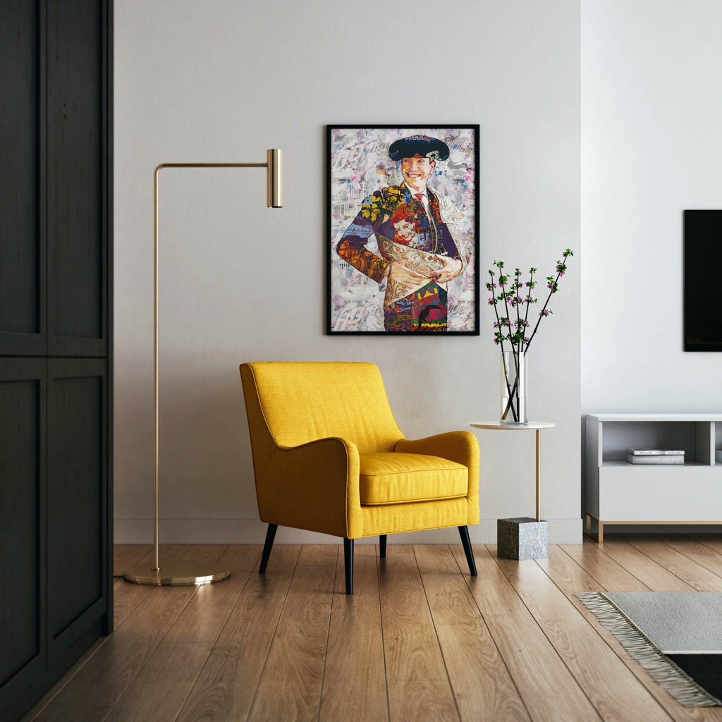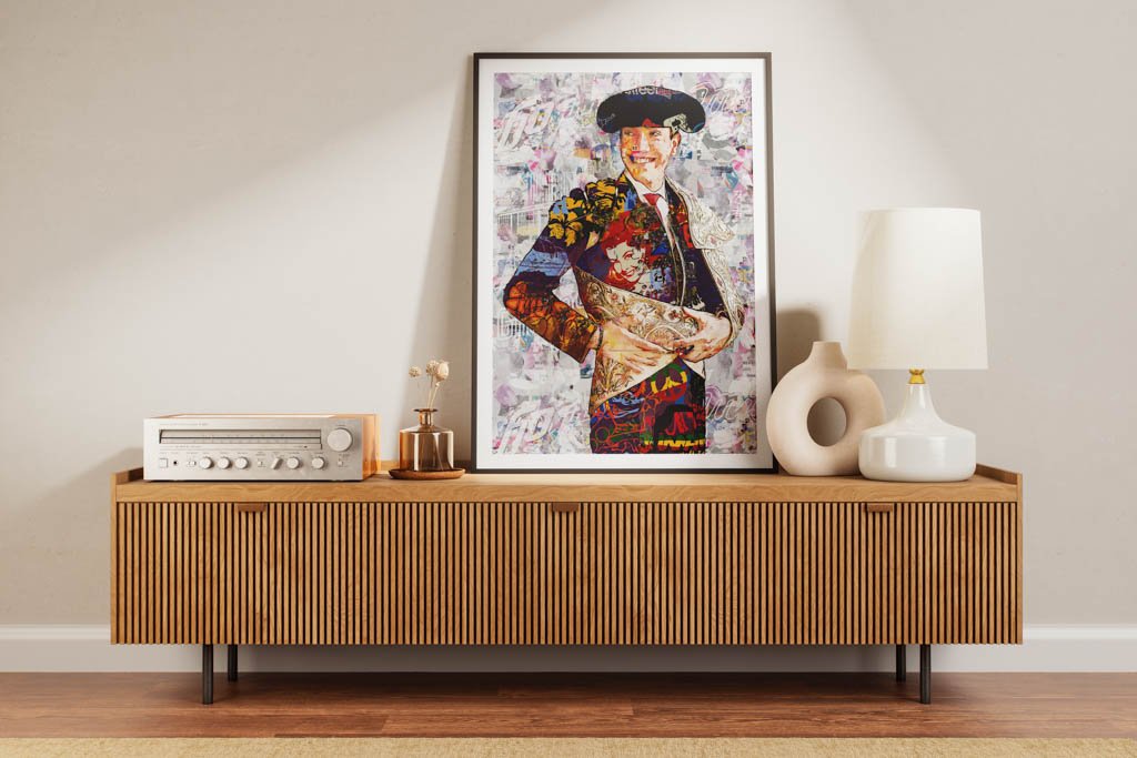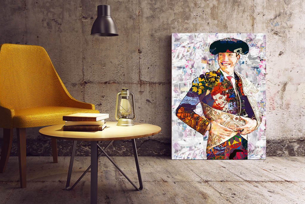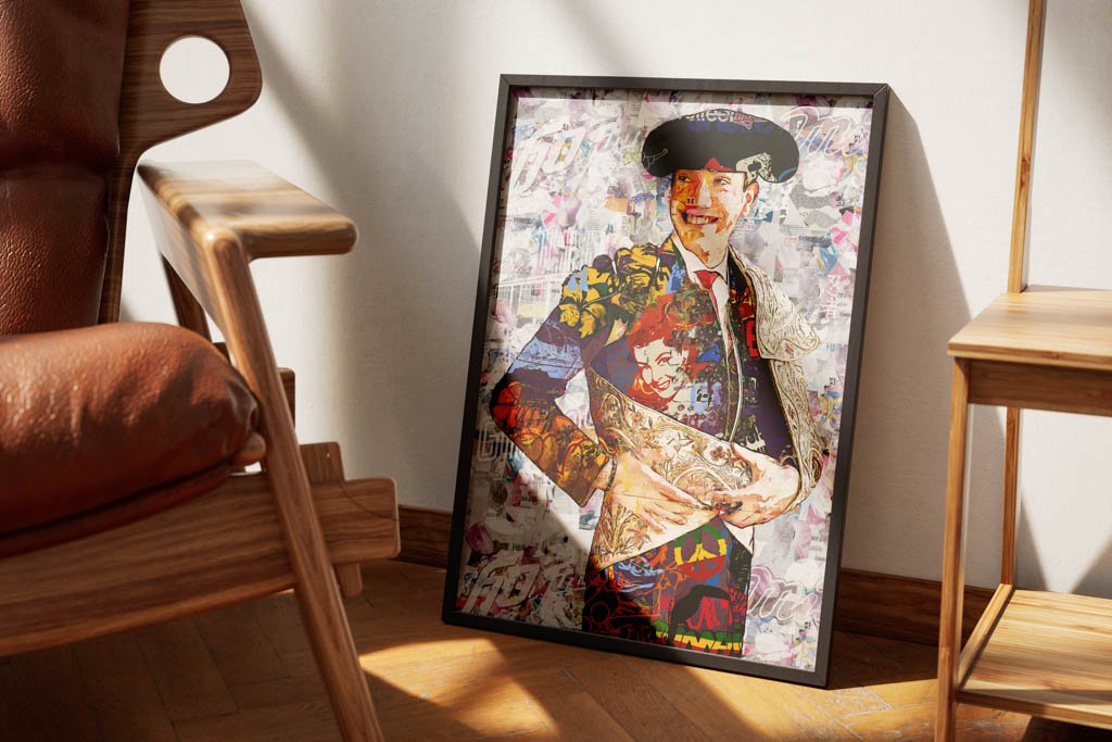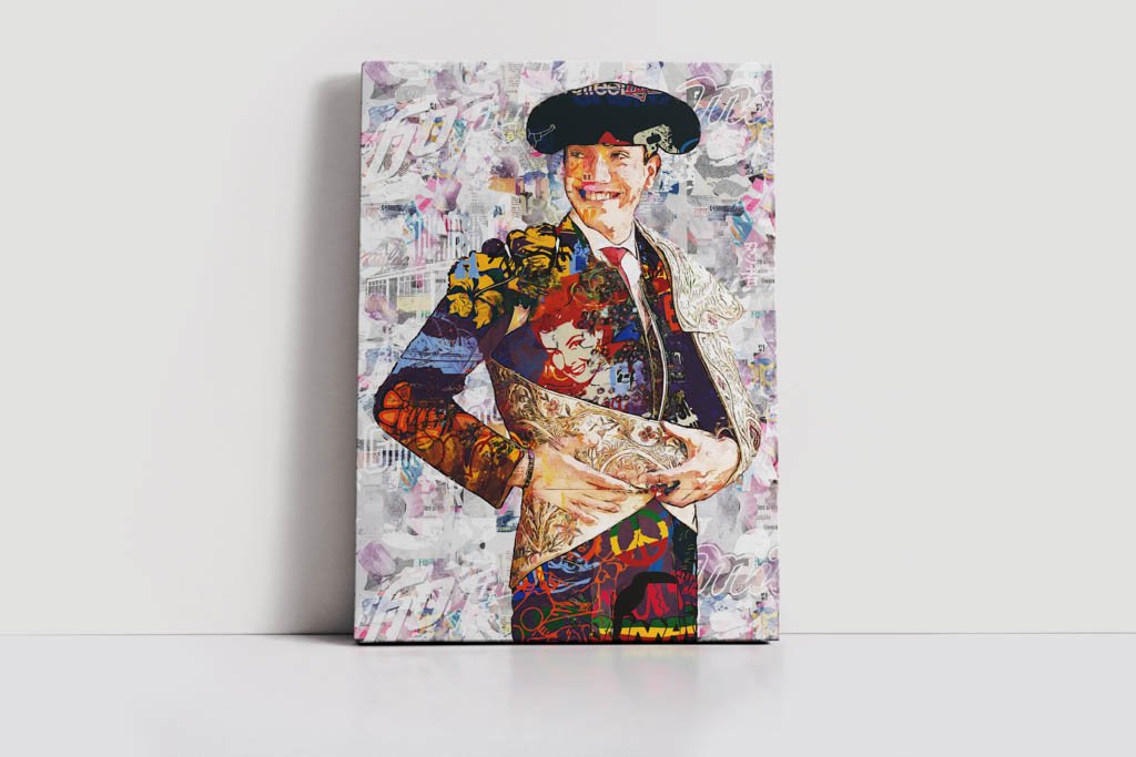 La paleta cromática combina tonos cálidos, contrastes intensos y detalles ornamentales que aportan profundidad, movimiento y sofisticación. La textura pictórica refuerza el valor artístico de la imagen y transforma el retrato en una interpretación moderna del universo taurino, pensada para espacios donde se valore el arte con carácter y personalidad.