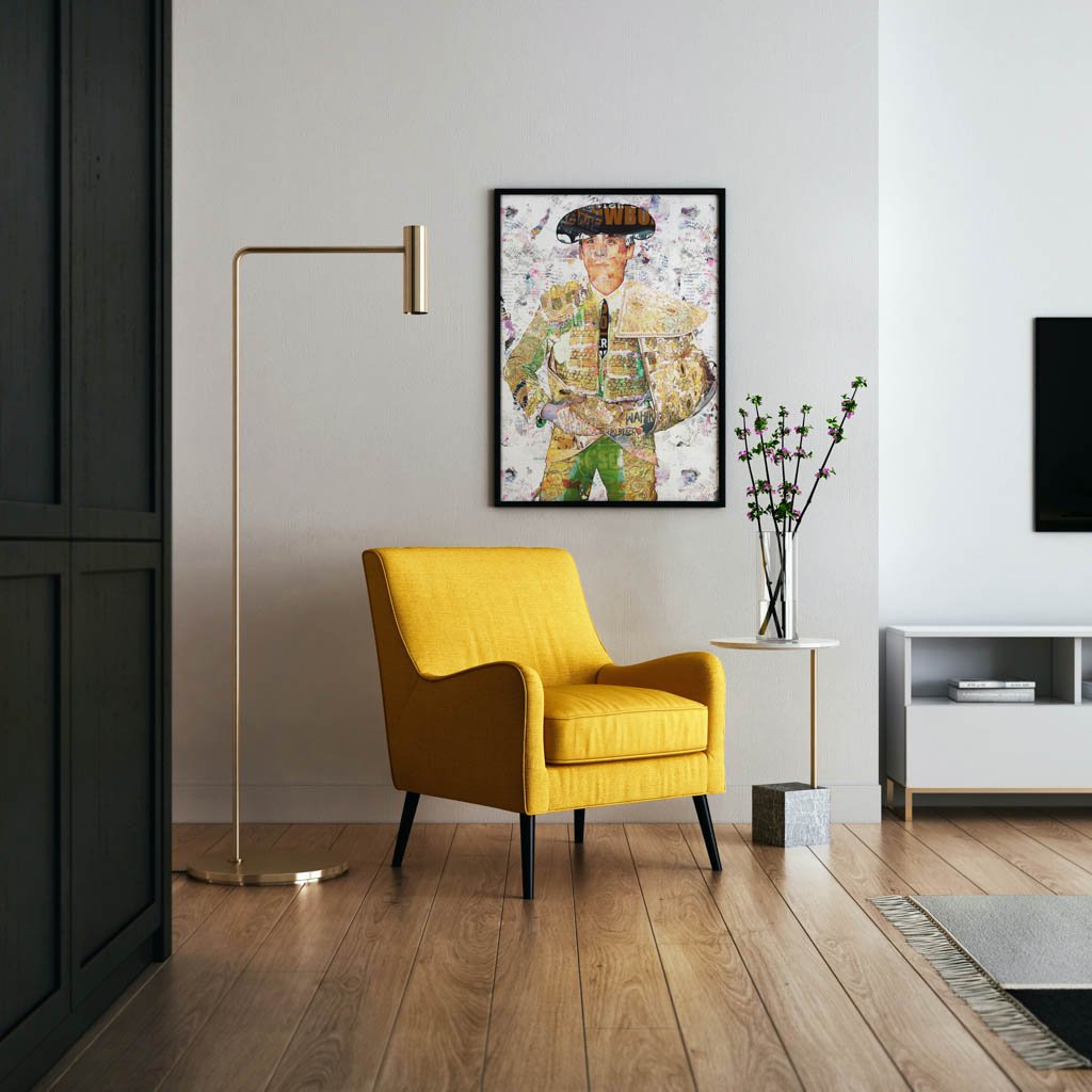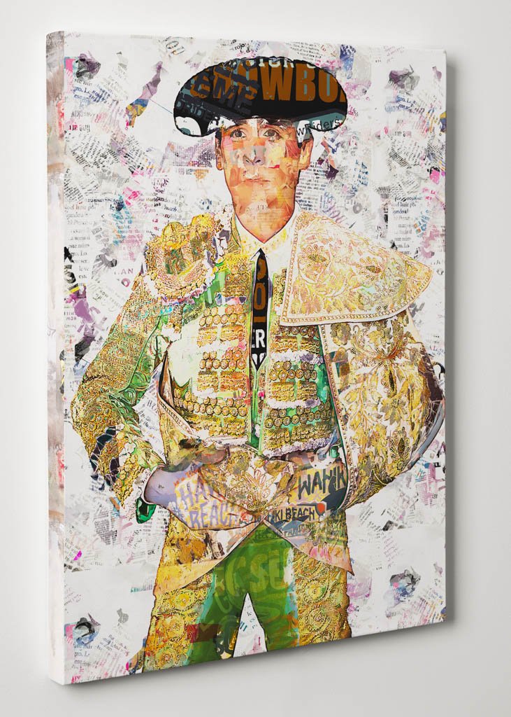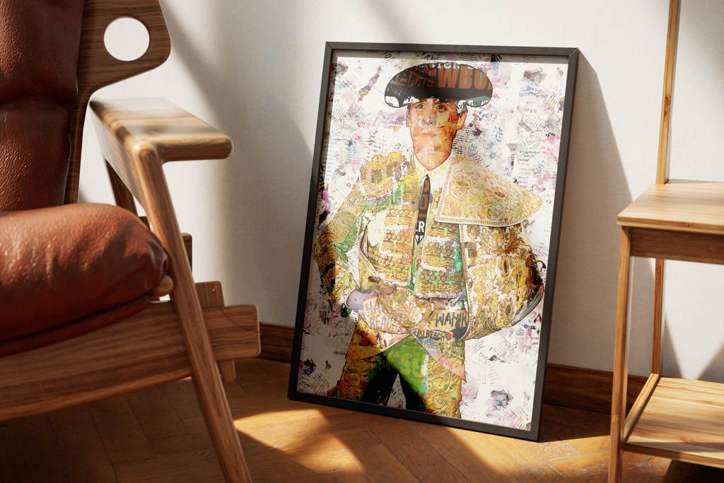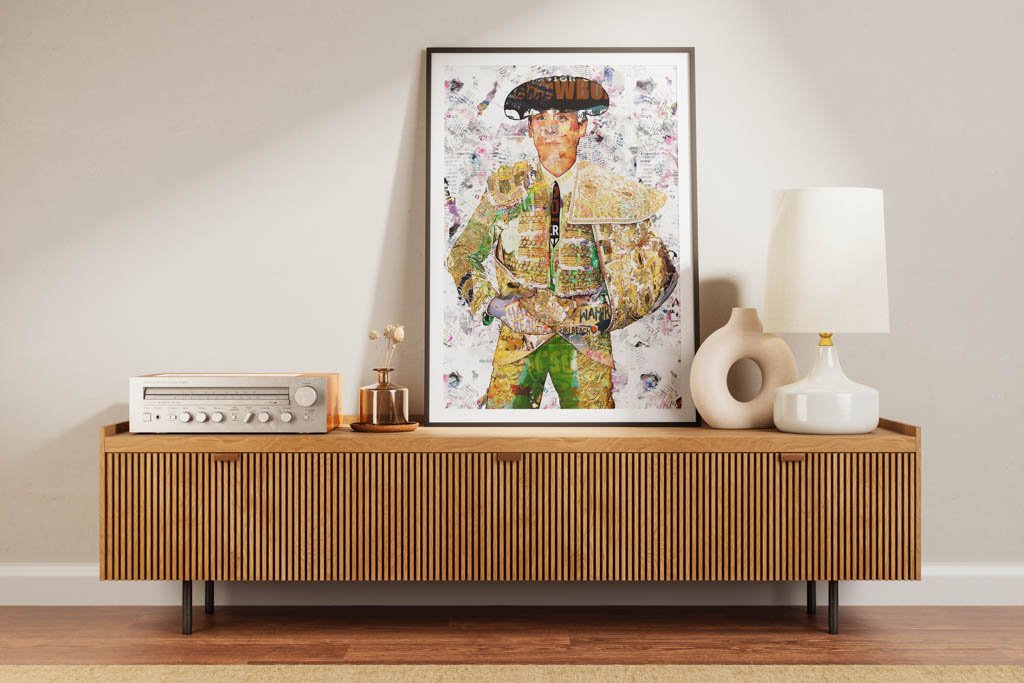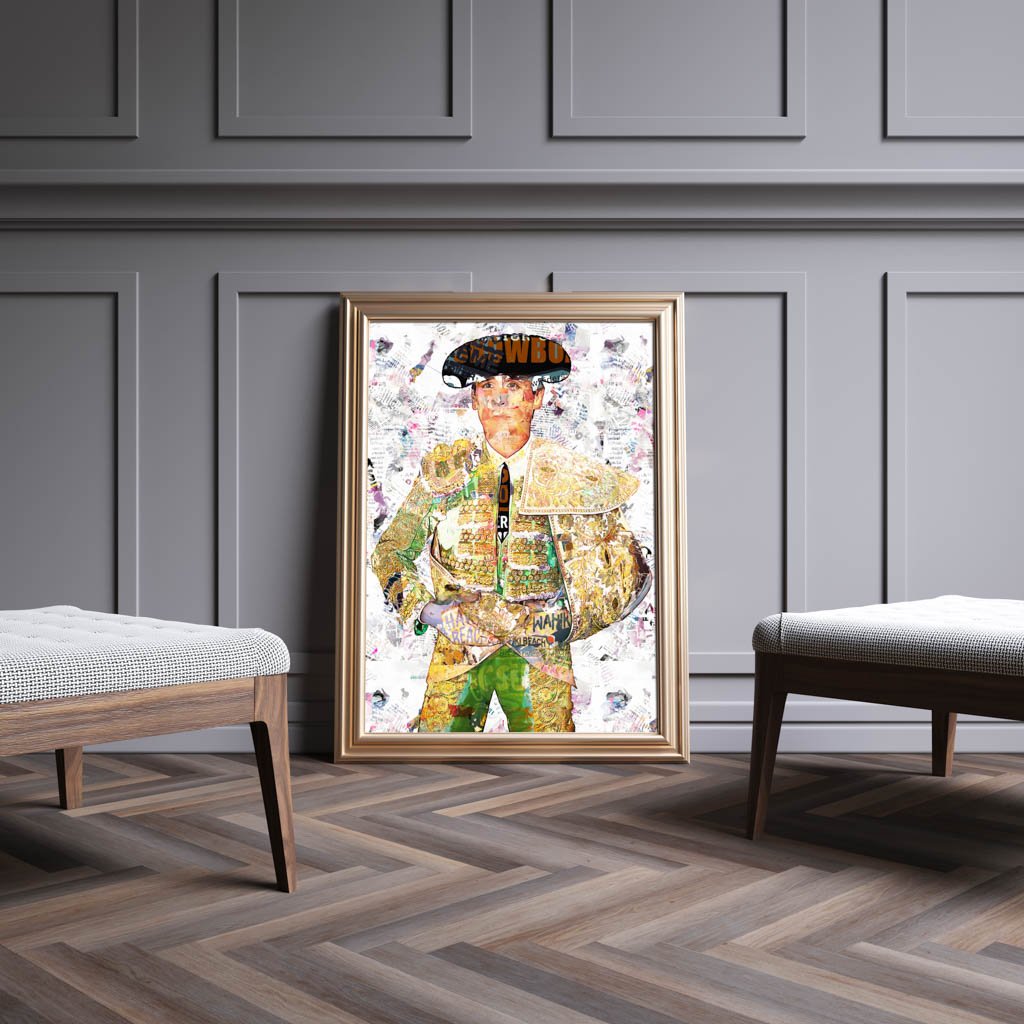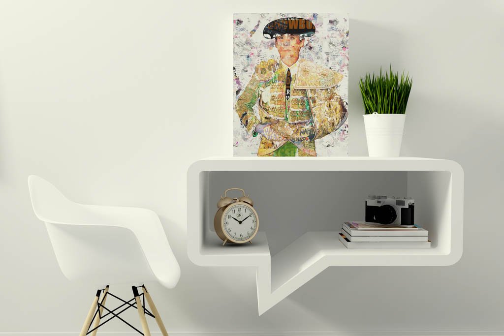 Dentro de la colección de cuadros modernos de toreros, esta obra destaca por su equilibrio y por la claridad con la que la figura ocupa el espacio. El fondo claro y texturado permite que toda la atención recaiga sobre el retrato, reforzando la presencia del traje y la nobleza del gesto. Esa limpieza compositiva convierte la pieza en una obra muy decorativa, refinada y fácil de integrar en interiores contemporáneos.