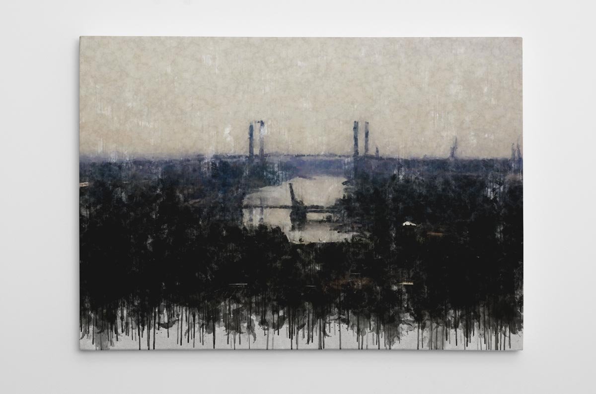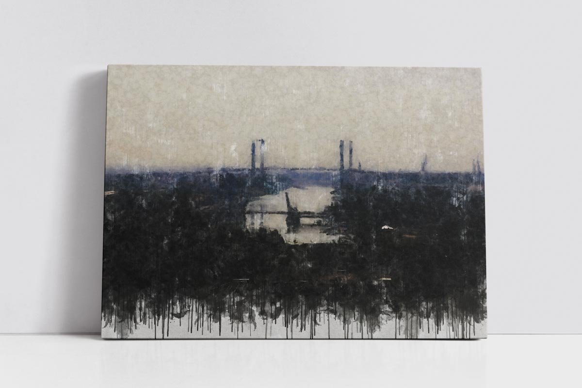 Uno de los aspectos más atractivos de Puentes de Sevilla es su tratamiento atmosférico. La ciudad aparece envuelta en tonos suaves y ligeramente velados que aportan profundidad, distancia visual y una gran sensación de calma. En primer plano, la vegetación oscura actúa como marco natural de la escena, mientras el río recoge la luz del cielo y conduce la mirada hacia el horizonte, donde los puentes se perfilan con elegancia.