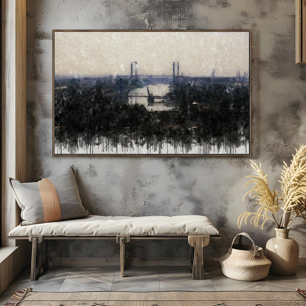 La paleta cromática refuerza esa sensación de equilibrio. La combinación de grises, azules suaves y tonos tierra crea una imagen contenida, sofisticada y muy fácil de integrar en interiores donde se busca una decoración serena. Esa riqueza tonal convierte la obra en una de las piezas más elegantes y pausadas dentro de la colección de cuadros modernos de Sevilla.