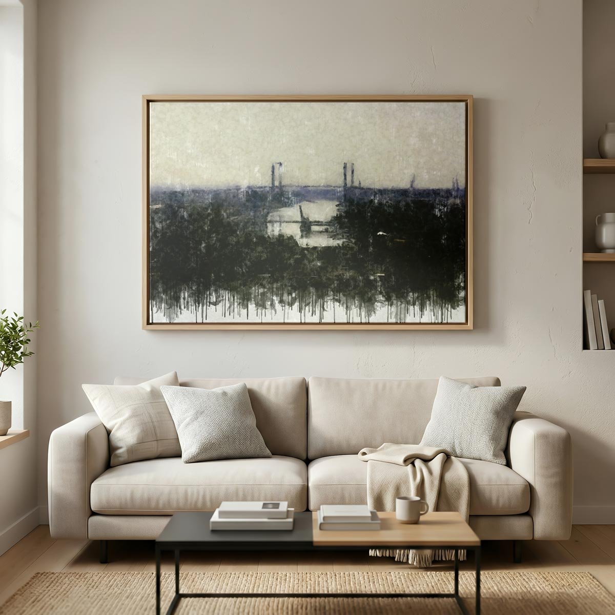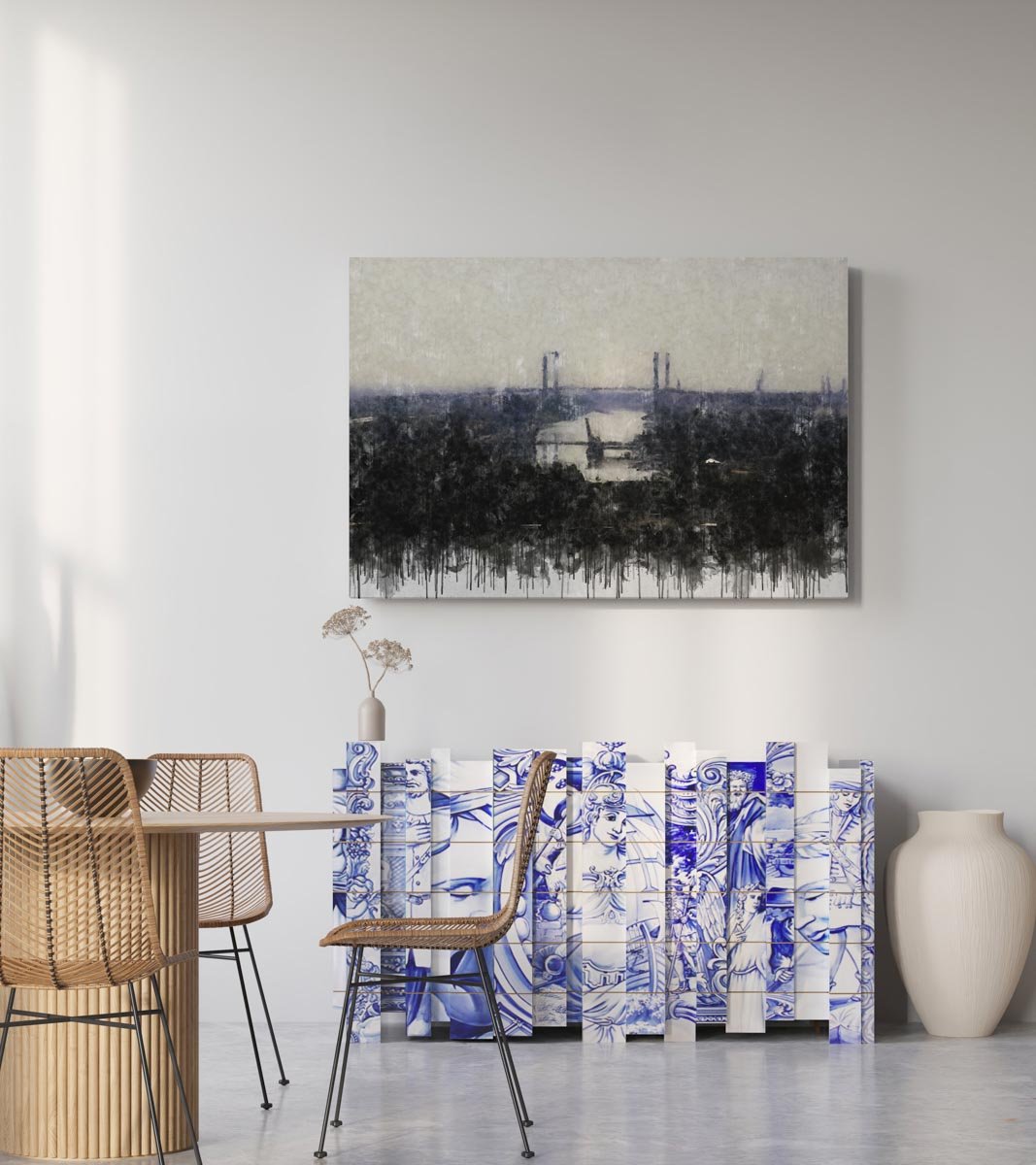 Puentes de Sevilla es una pieza ideal para quienes buscan un cuadro moderno de Sevilla con una visión panorámica, elegante y contemporánea de la ciudad. Por su composición abierta, su atmósfera tranquila y la presencia del Guadalquivir, encaja especialmente bien en salones, despachos, estudios o pisos turísticos que quieran incorporar una imagen equilibrada, sofisticada y con esencia sevillana.