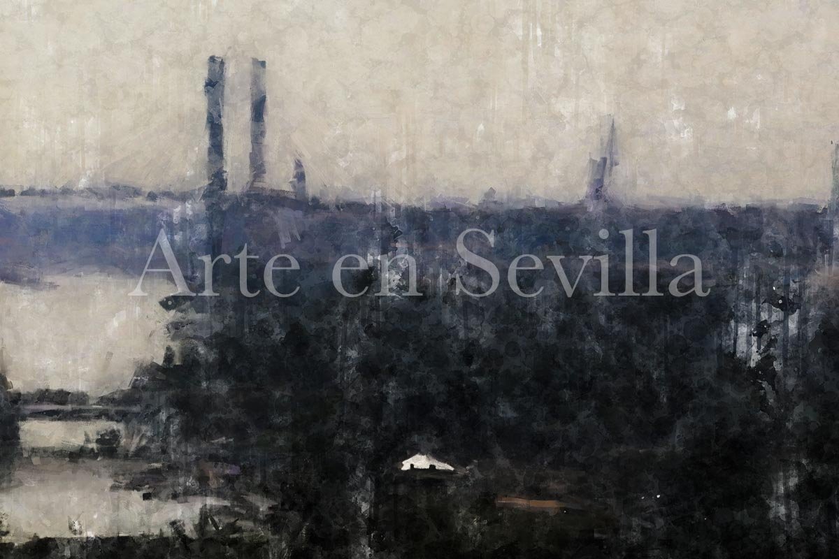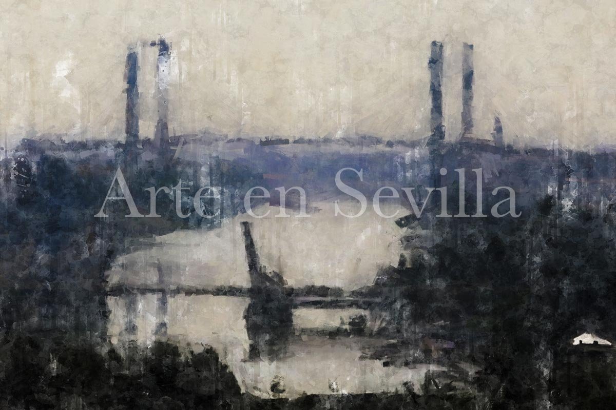 La escena muestra el horizonte fluvial de Sevilla desde una visión casi panorámica. En la distancia se distinguen varias estructuras que cruzan el río, destacando los grandes puentes que forman parte del paisaje contemporáneo de la ciudad. Estas líneas arquitectónicas se elevan sobre el horizonte y dibujan una imagen equilibrada, abierta y silenciosa que define el carácter de la obra.