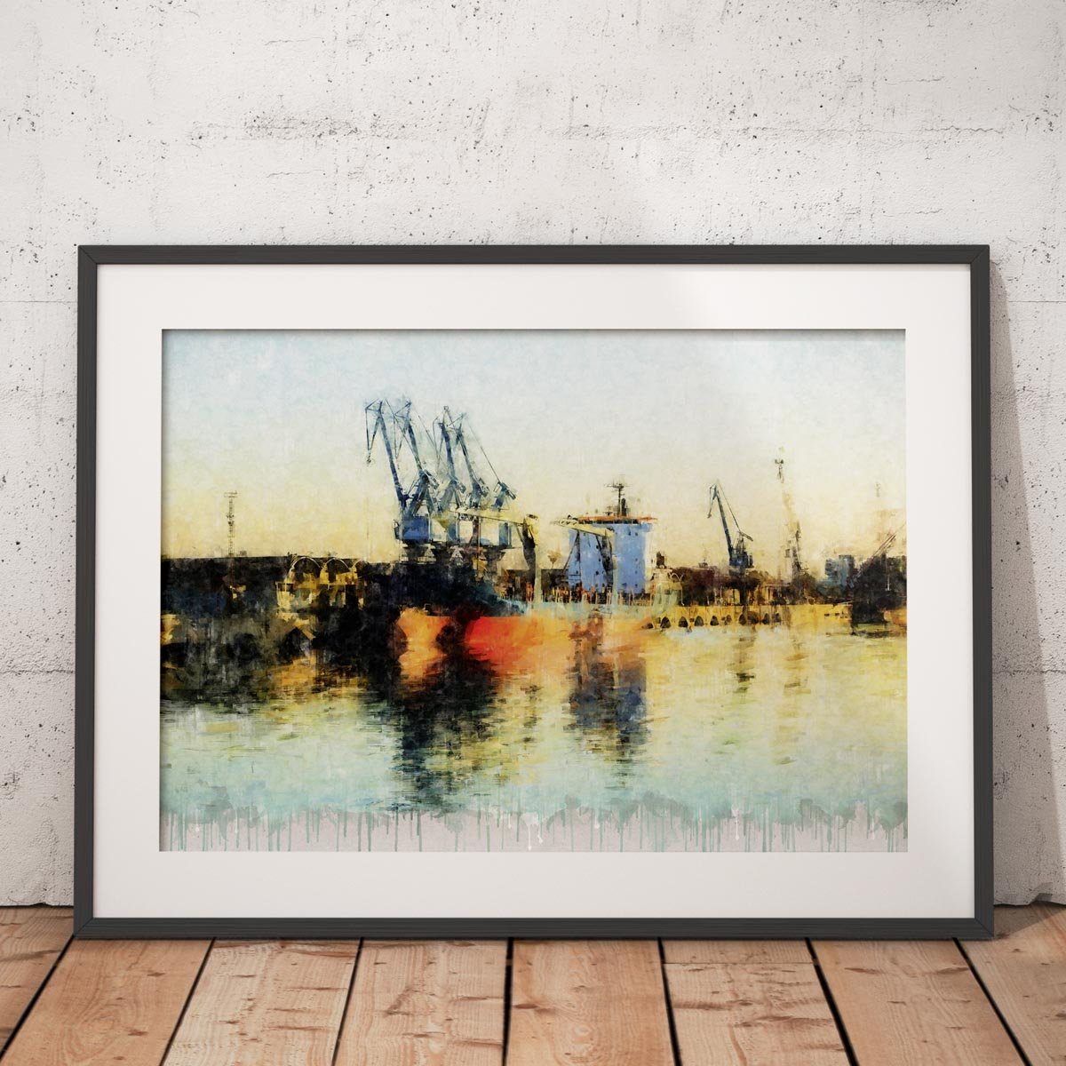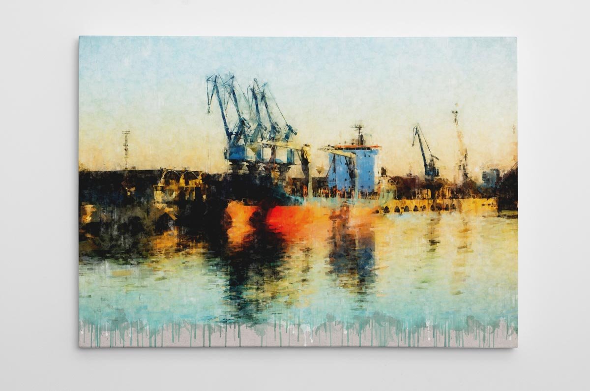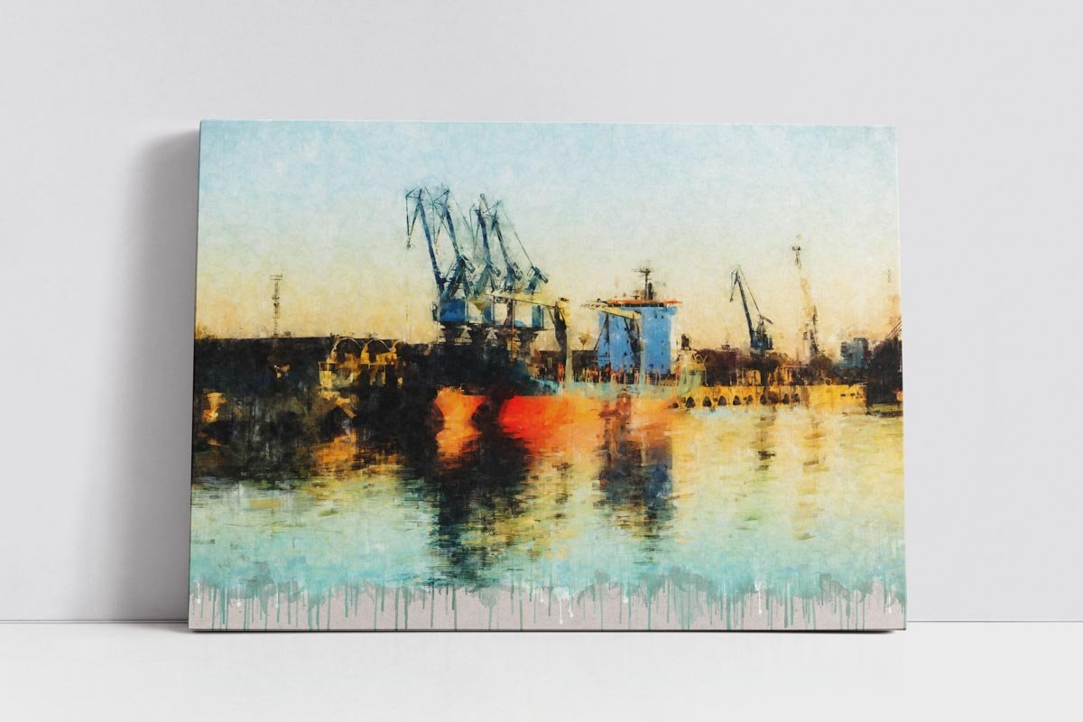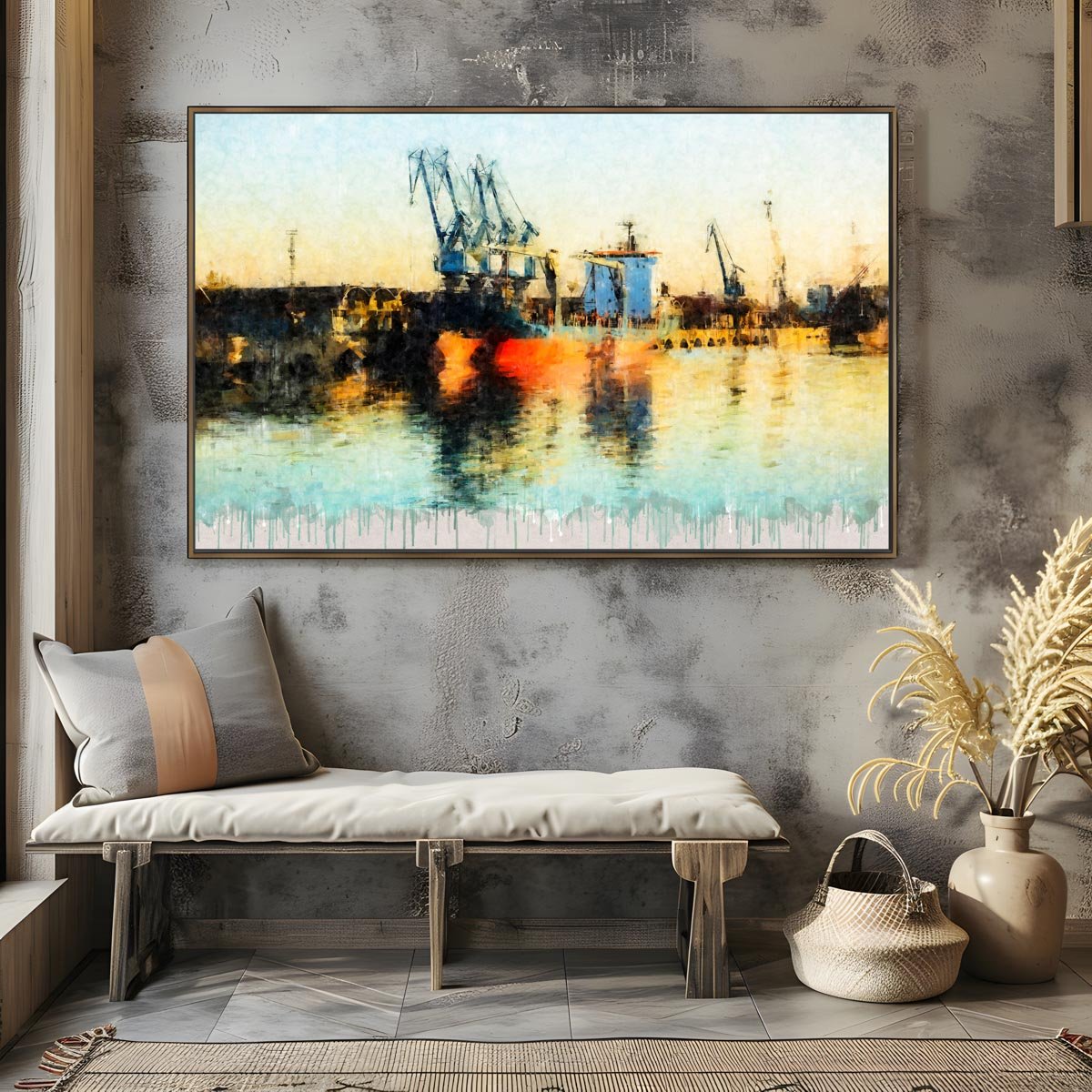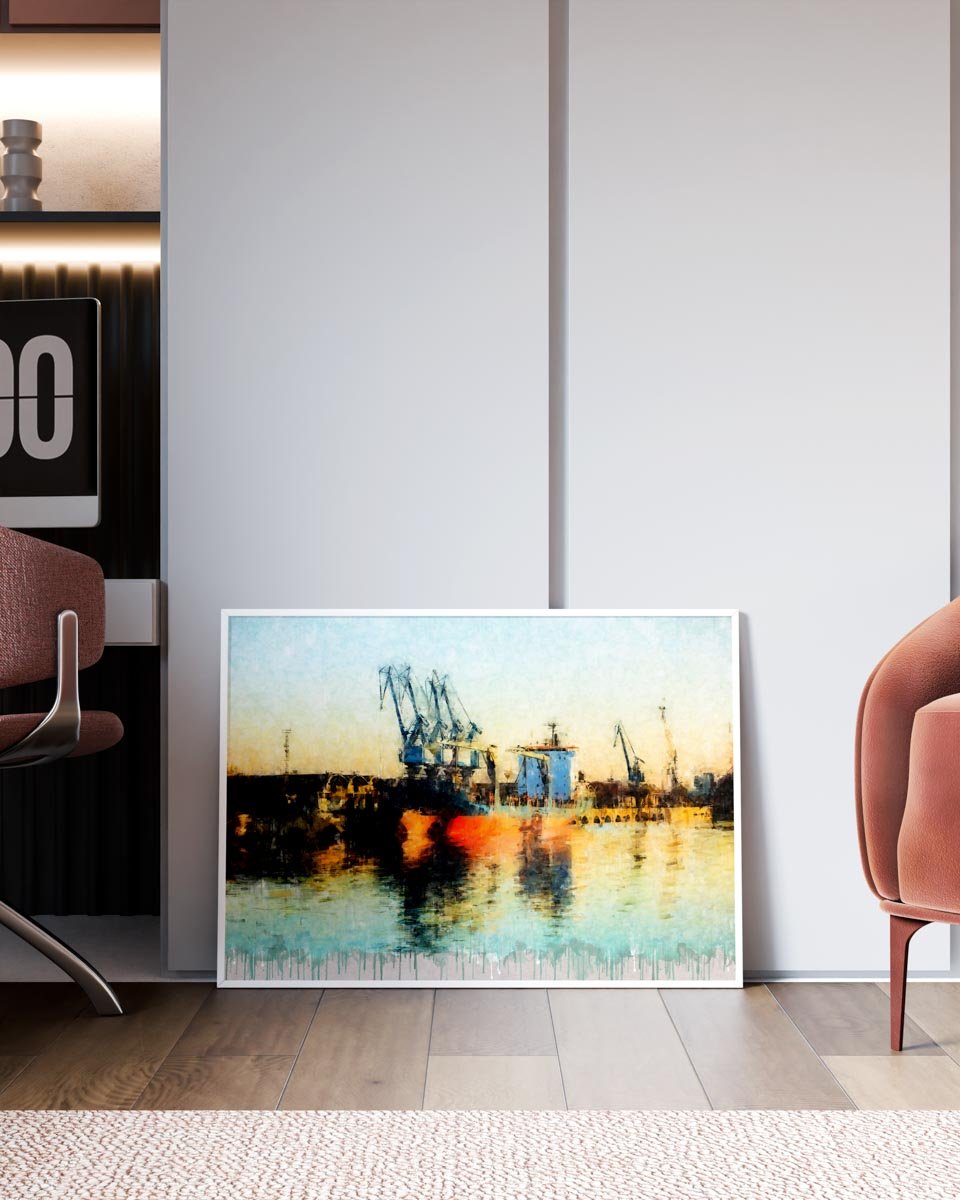La paleta cromática combina tonos cálidos, reflejos dorados y azules suaves que llenan la escena de luz y contraste. La textura pictórica refuerza el carácter artístico de la obra y transforma el paisaje portuario en una composición elegante y actual. Como en otras piezas de la colección, el acabado inferior con efecto de goteo introduce un lenguaje visual contemporáneo que añade personalidad y cohesión estética al conjunto.