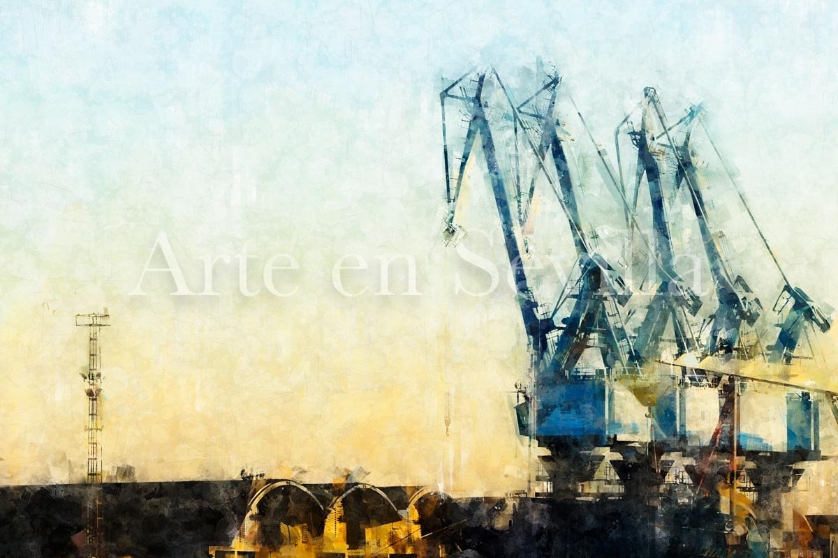 En la composición destacan las grandes grúas portuarias, que dominan el horizonte y se convierten en las auténticas protagonistas de la imagen. Sus líneas verticales y diagonales aportan dinamismo al paisaje, mientras las instalaciones portuarias y las embarcaciones completan una escena que remite a la actividad histórica del puerto sevillano, uno de los pocos puertos marítimos interiores de Europa.