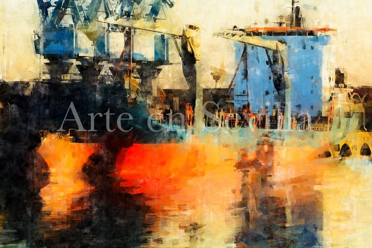 Puerto de Sevilla es un cuadro moderno de Sevilla que explora una faceta distinta, contemporánea y menos habitual de la ciudad: su dimensión portuaria e industrial. La obra se centra en el paisaje del puerto, donde las grúas y estructuras marítimas se elevan sobre el Guadalquivir creando una escena de gran fuerza visual, amplitud y carácter.