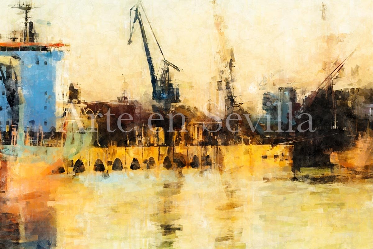 Puerto de Sevilla es una obra ideal para quienes buscan un cuadro moderno de Sevilla con una visión diferente, sofisticada y poco convencional de la ciudad. Por su mezcla de paisaje fluvial, arquitectura industrial y reflejos de luz, encaja especialmente bien en salones contemporáneos, despachos, estudios o pisos turísticos que quieran incorporar una imagen moderna, original y llena de esencia sevillana.