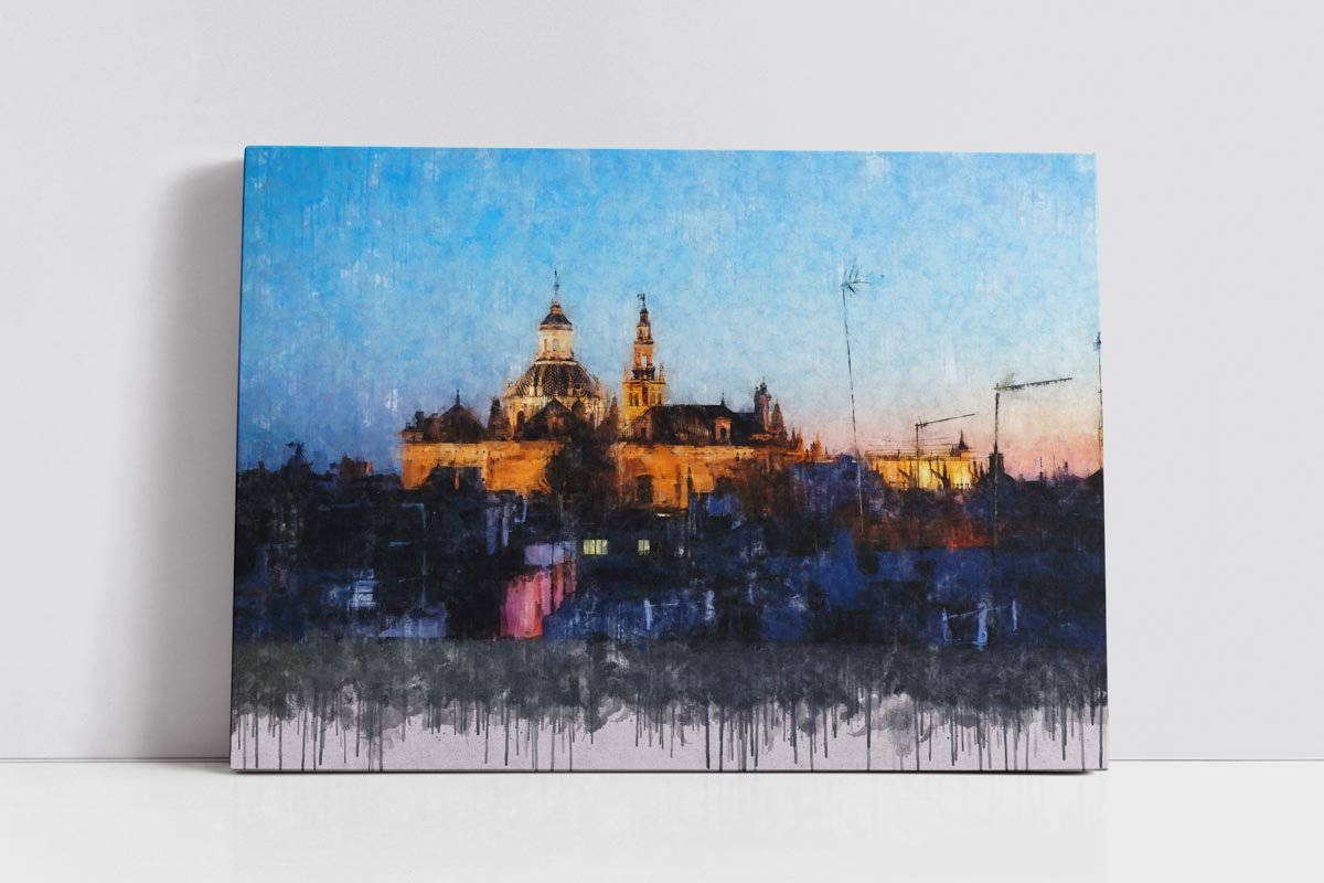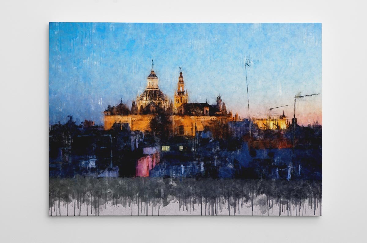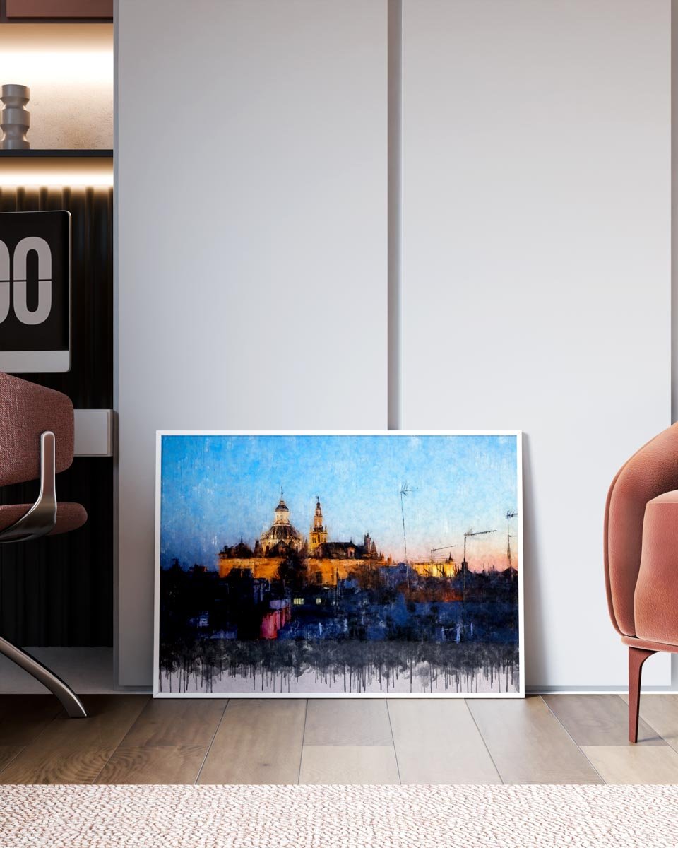El Salvador y la Giralda de Sevilla es una obra ideal para quienes buscan un cuadro moderno de Sevilla que represente el corazón monumental de la ciudad desde una perspectiva urbana, auténtica y atmosférica. Por su mezcla de arquitectura histórica, azoteas y luz cálida, encaja especialmente bien en salones, estudios, despachos o pisos turísticos que quieran incorporar una imagen elegante y reconocible del paisaje sevillano.