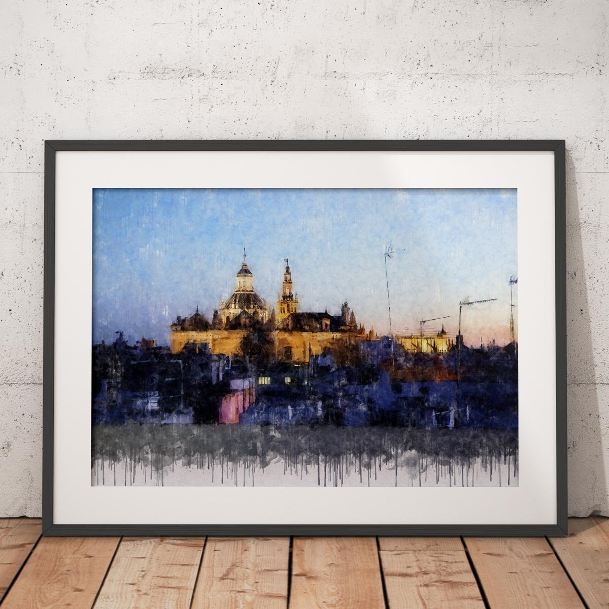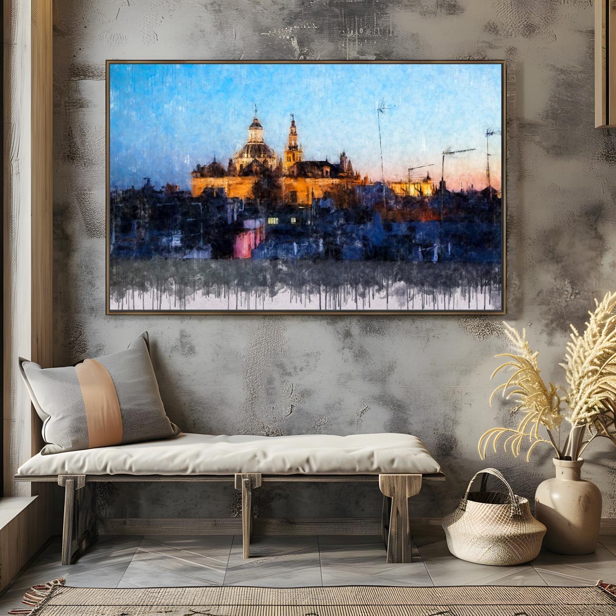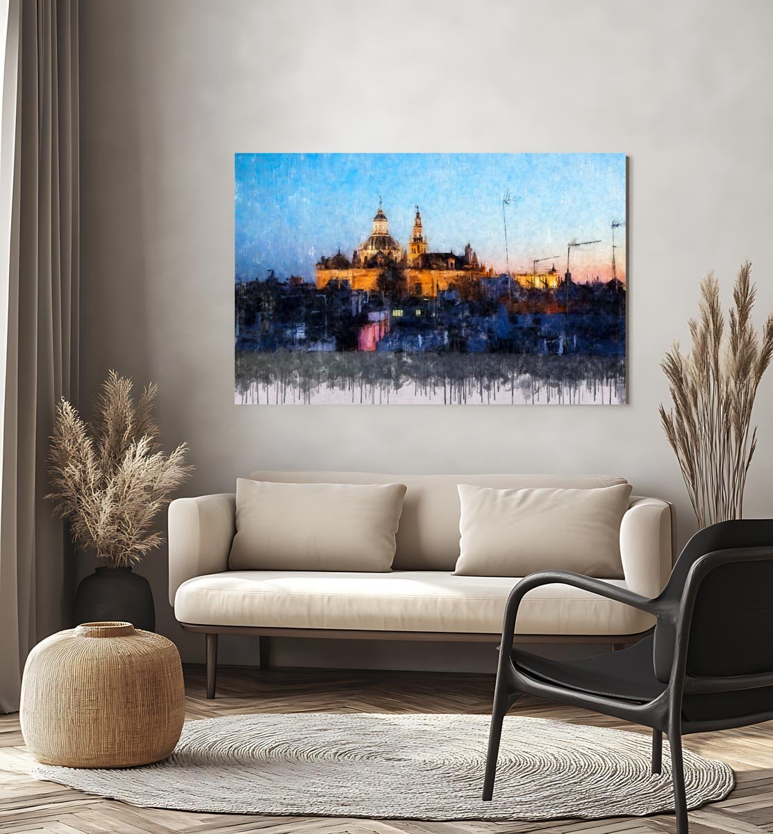 El Salvador y la Giralda de Sevilla es una obra ideal para quienes buscan un cuadro moderno de Sevilla que represente el corazón monumental de la ciudad desde una perspectiva urbana, auténtica y atmosférica. Por su mezcla de arquitectura histórica, azoteas y luz cálida, encaja especialmente bien en salones, estudios, despachos o pisos turísticos que quieran incorporar una imagen elegante y reconocible del paisaje sevillano.