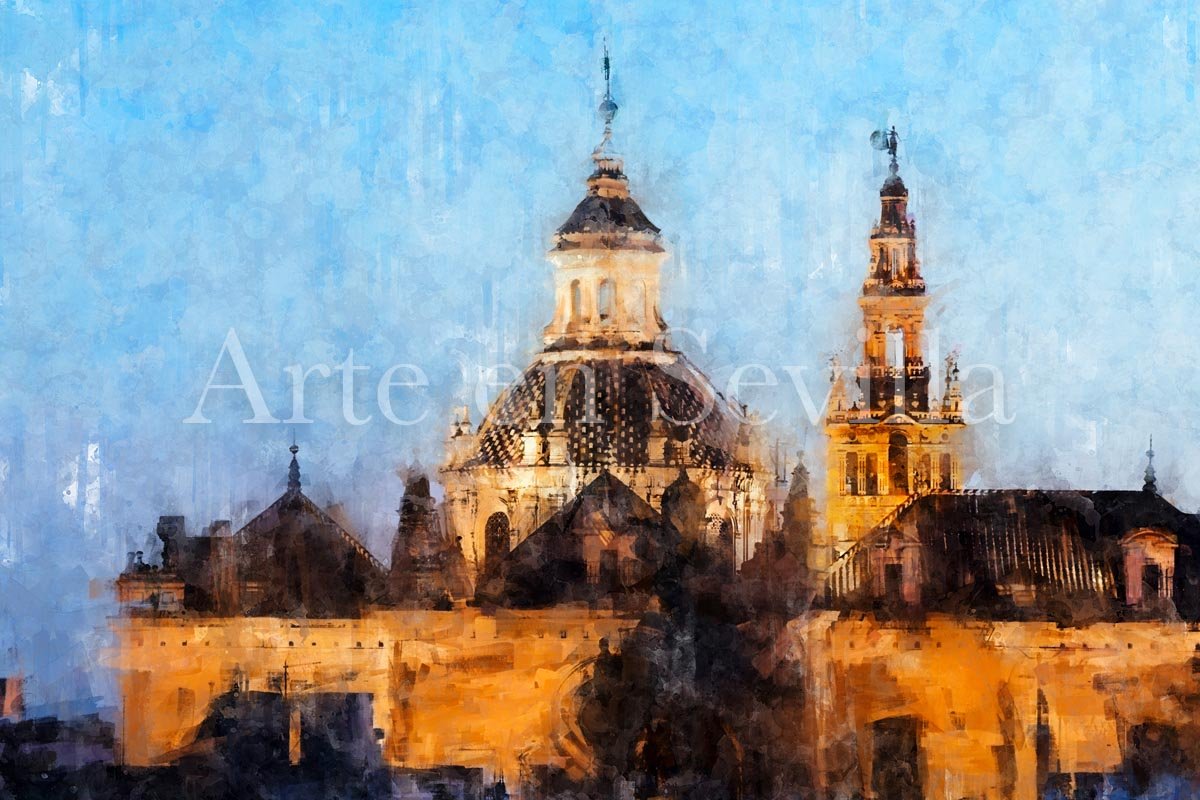 En el centro de la composición aparece la cúpula del Salvador, uno de los templos más emblemáticos de la ciudad, cuya silueta clara se recorta con nitidez sobre el fondo azul del cielo. A su lado emerge la Giralda, bañada por una luz cálida que resalta su presencia y la convierte en uno de los focos visuales más intensos de la escena. Esa combinación entre ambos monumentos crea una imagen profundamente sevillana y llena de carácter.