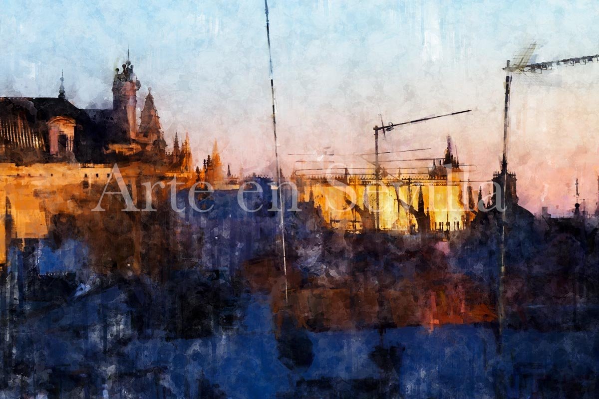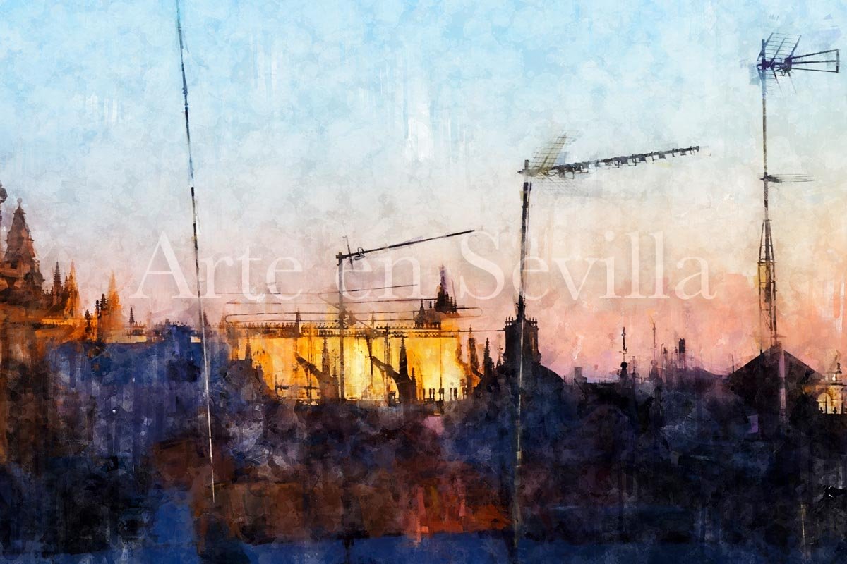 El Salvador y la Giralda de Sevilla es un cuadro moderno de Sevilla que capta con gran fuerza visual la identidad del casco histórico sevillano. La obra presenta una vista urbana en la que las azoteas, antenas y volúmenes cotidianos de la ciudad forman un primer plano oscuro sobre el que se elevan, iluminados, dos de los elementos más reconocibles del skyline de Sevilla: la Iglesia del Salvador y la Giralda.