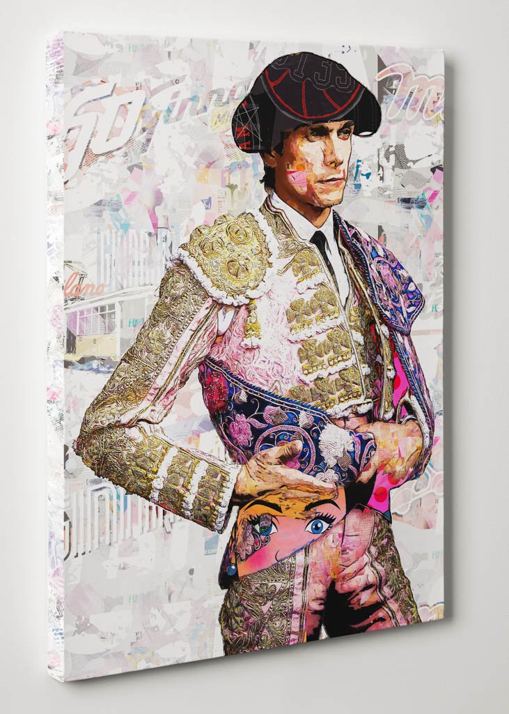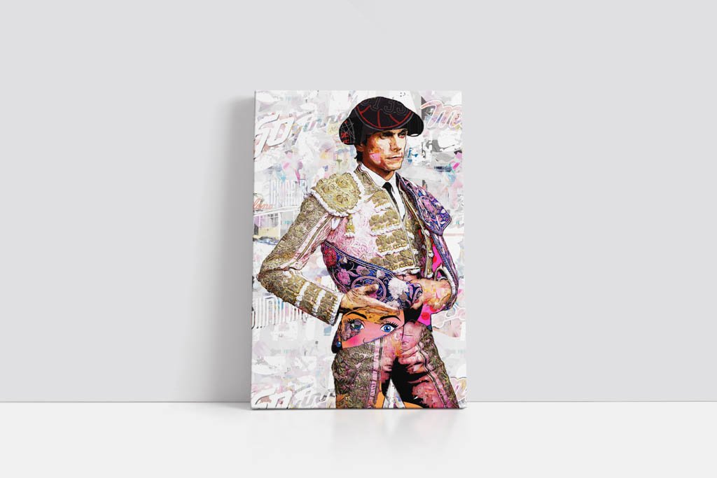 El tratamiento contemporáneo del traje de luces y del capote refuerza esa identidad visual. Los bordados tradicionales dialogan con una superficie llena de textura, superposiciones gráficas y matices cromáticos que actualizan la imagen sin hacerle perder su esencia taurina. El resultado es una obra que une tradición, sensibilidad decorativa y lenguaje artístico contemporáneo.