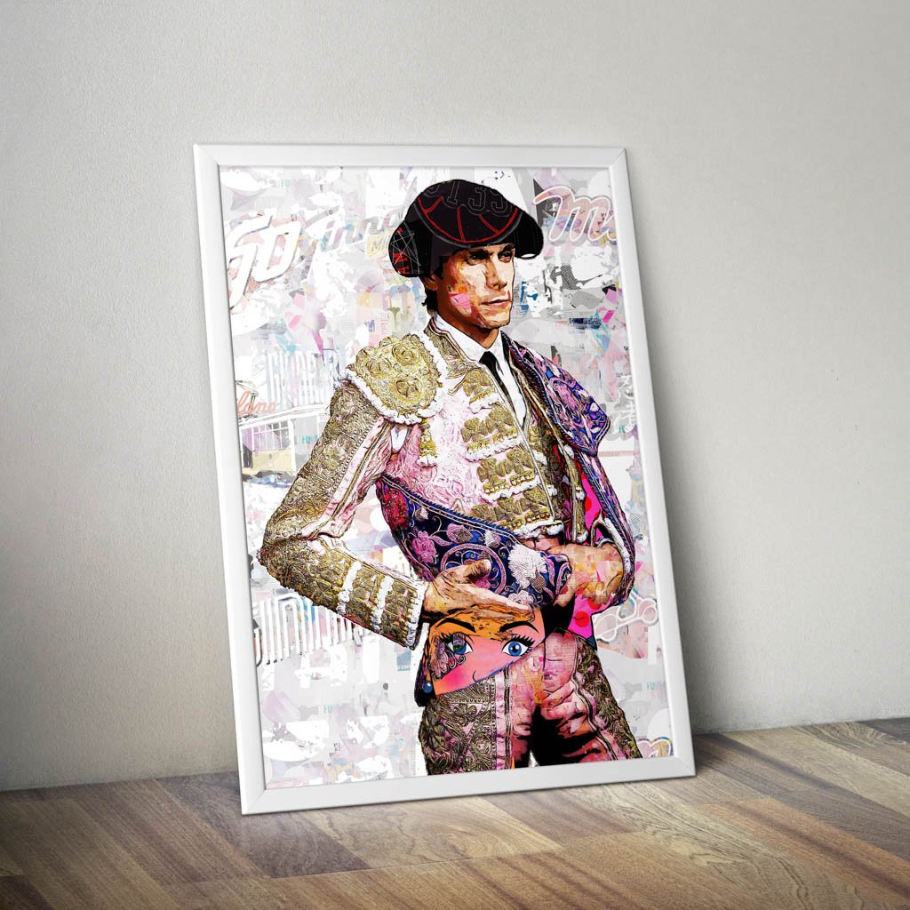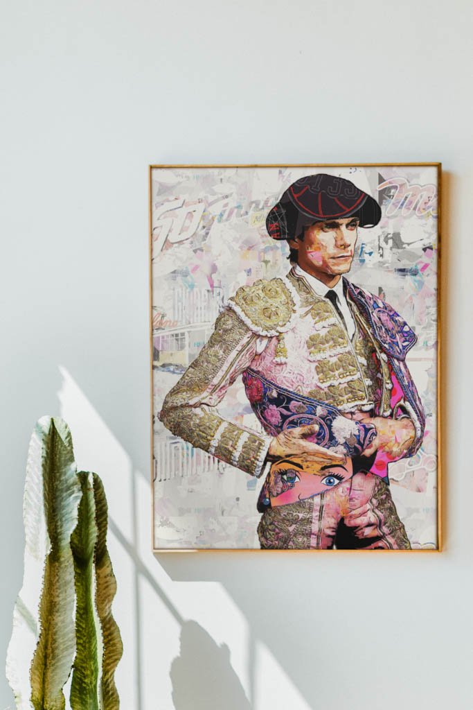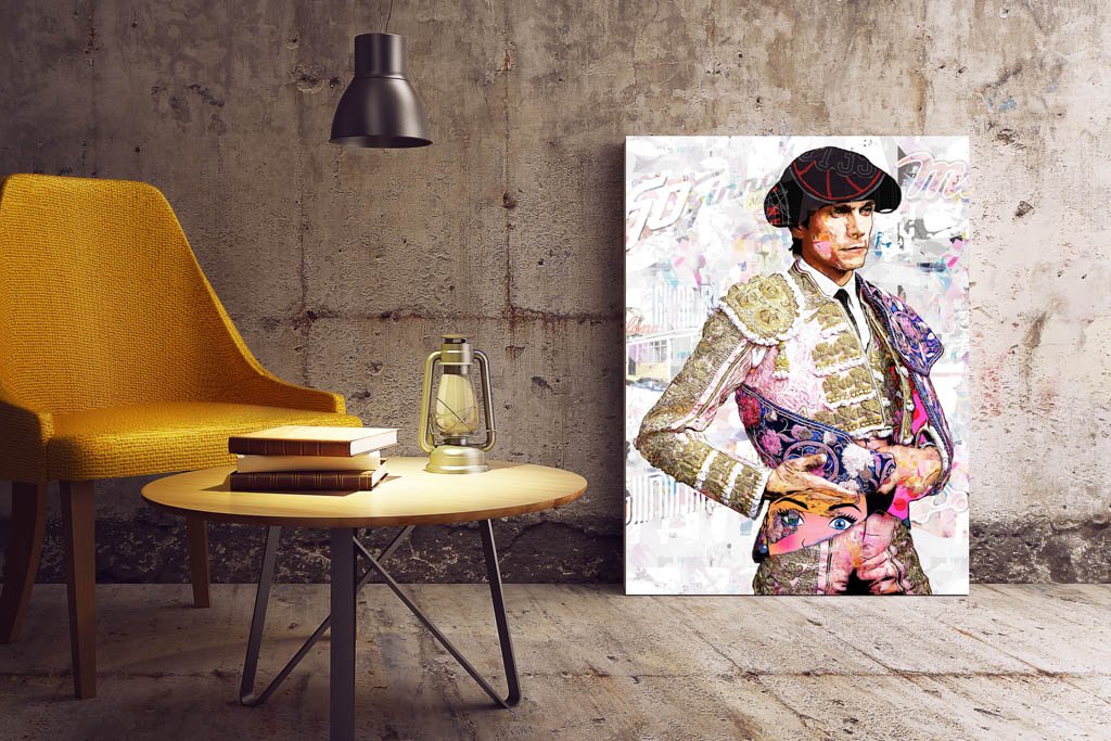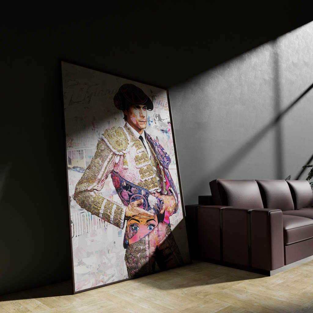 Dentro de la colección de cuadros modernos de toreros, esta pieza destaca por su equilibrio entre delicadeza visual y fuerza expresiva. La figura ocupa el espacio con claridad, mientras el fondo claro y texturado permite que toda la atención recaiga sobre el rostro, el traje y el capote. Esa limpieza compositiva convierte la obra en una pieza muy elegante, fácil de integrar y con gran capacidad decorativa.