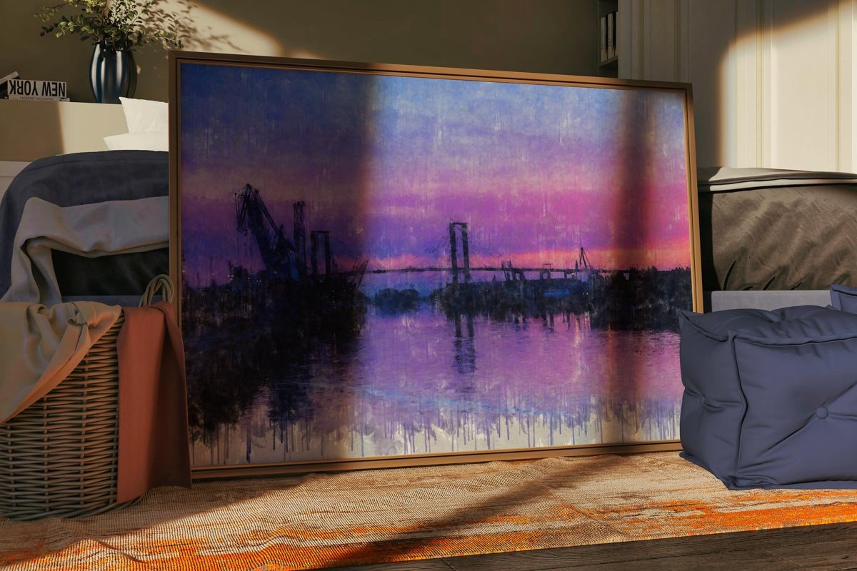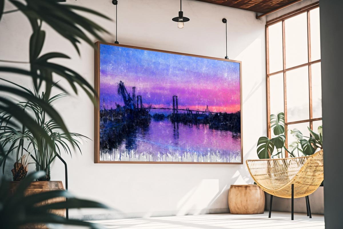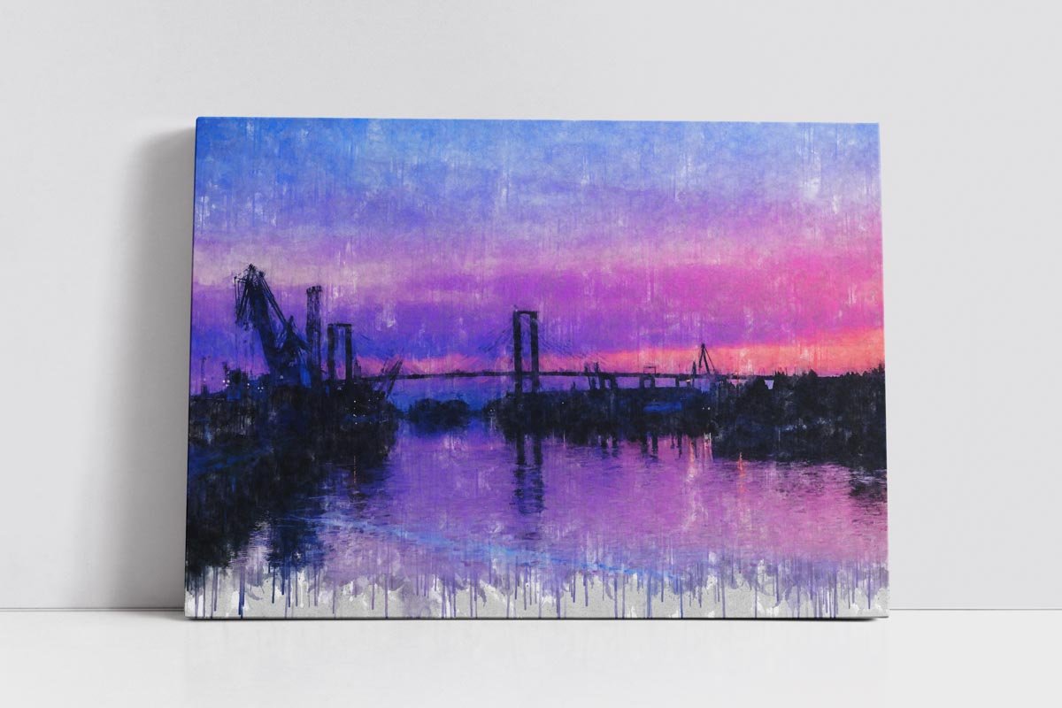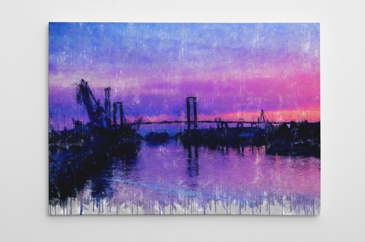 En el horizonte se dibuja el paisaje fluvial y portuario de la ciudad, donde se distinguen las grúas del puerto y las estructuras de los grandes puentes que atraviesan el río. Estas siluetas aparecen suavemente recortadas sobre el fondo del cielo, creando una imagen equilibrada, abierta y contemplativa que define el carácter de esta obra.