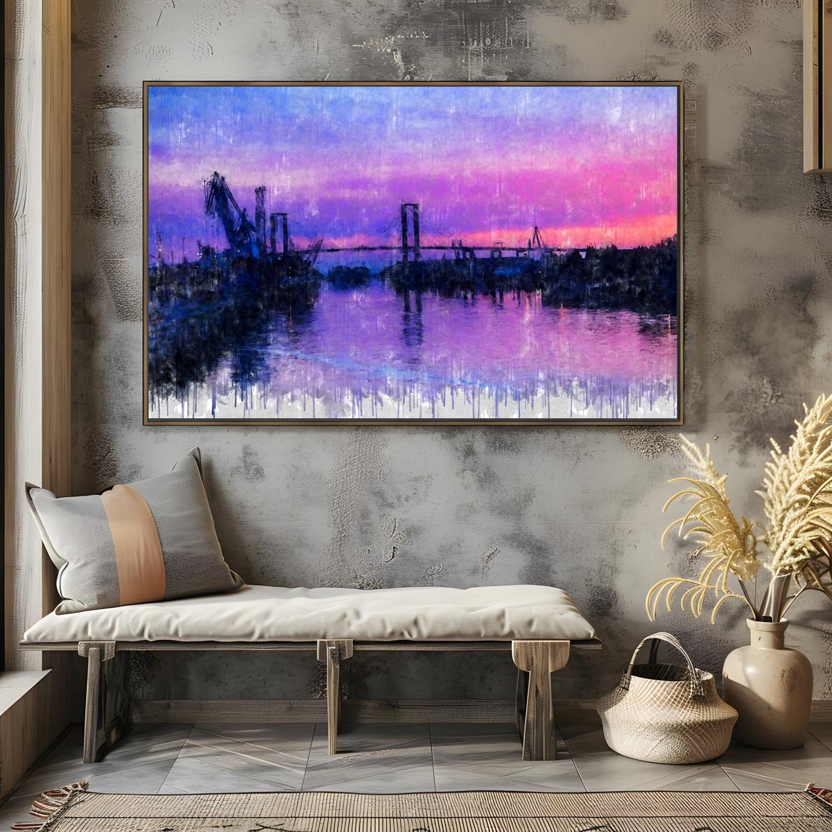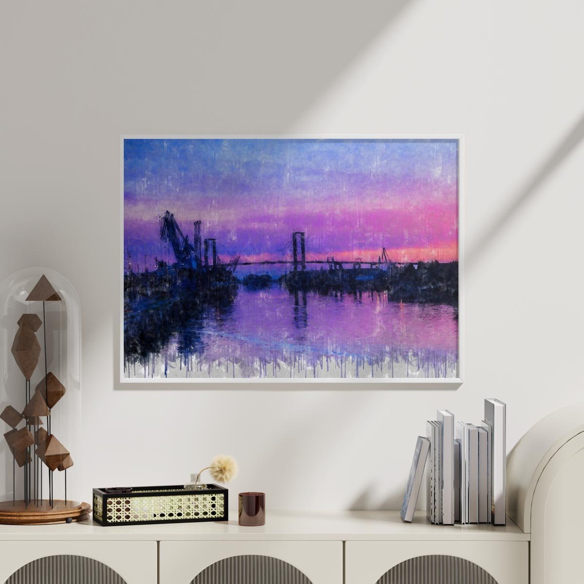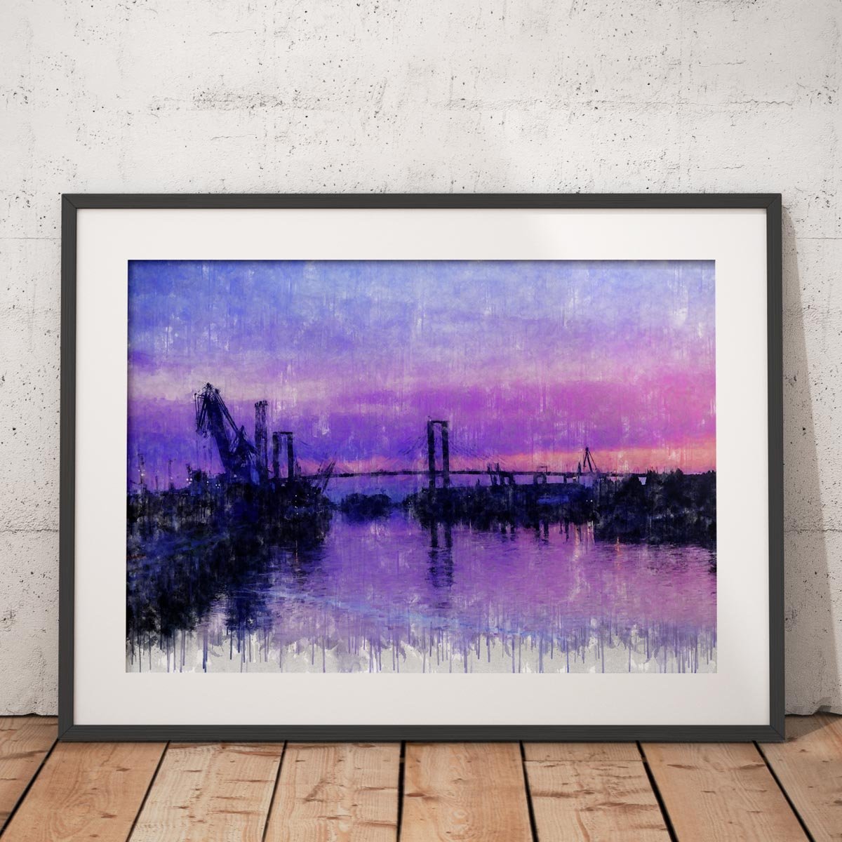 En el horizonte se dibuja el paisaje fluvial y portuario de la ciudad, donde se distinguen las grúas del puerto y las estructuras de los grandes puentes que atraviesan el río. Estas siluetas aparecen suavemente recortadas sobre el fondo del cielo, creando una imagen equilibrada, abierta y contemplativa que define el carácter de esta obra.