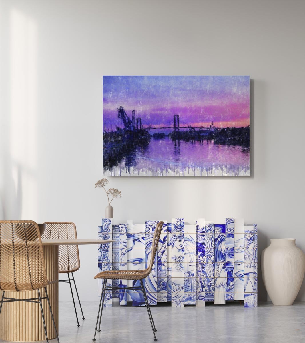 Semblanzas del Guadalquivir es una obra ideal para quienes buscan un cuadro moderno de Sevilla con una estética elegante, atmosférica y llena de matices. Por su mezcla de paisaje fluvial, reflejos y color, encaja especialmente bien en salones, estudios, despachos o pisos turísticos que quieran incorporar una imagen evocadora del río y del paisaje sevillano.