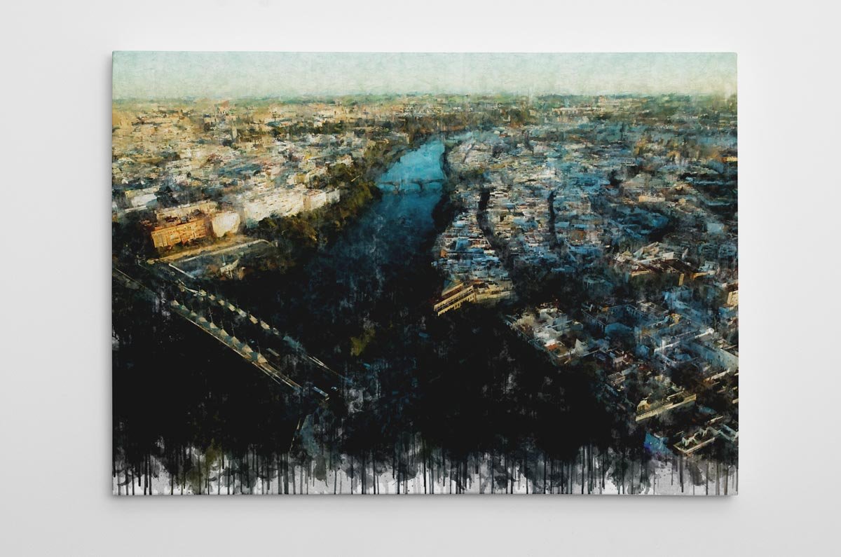 Desde esta altura, la ciudad aparece como un entramado de calles, edificios y barrios que se extienden a ambos lados del río. En primer plano se distingue uno de los puentes que conecta las dos orillas, mientras el Guadalquivir serpentea suavemente hacia el fondo de la escena, guiando la mirada y estructurando toda la composición. Ese recurso convierte la obra en una interpretación muy potente de la escala real de Sevilla.