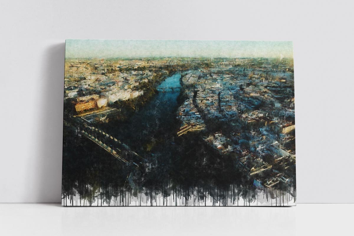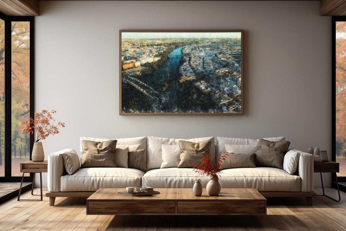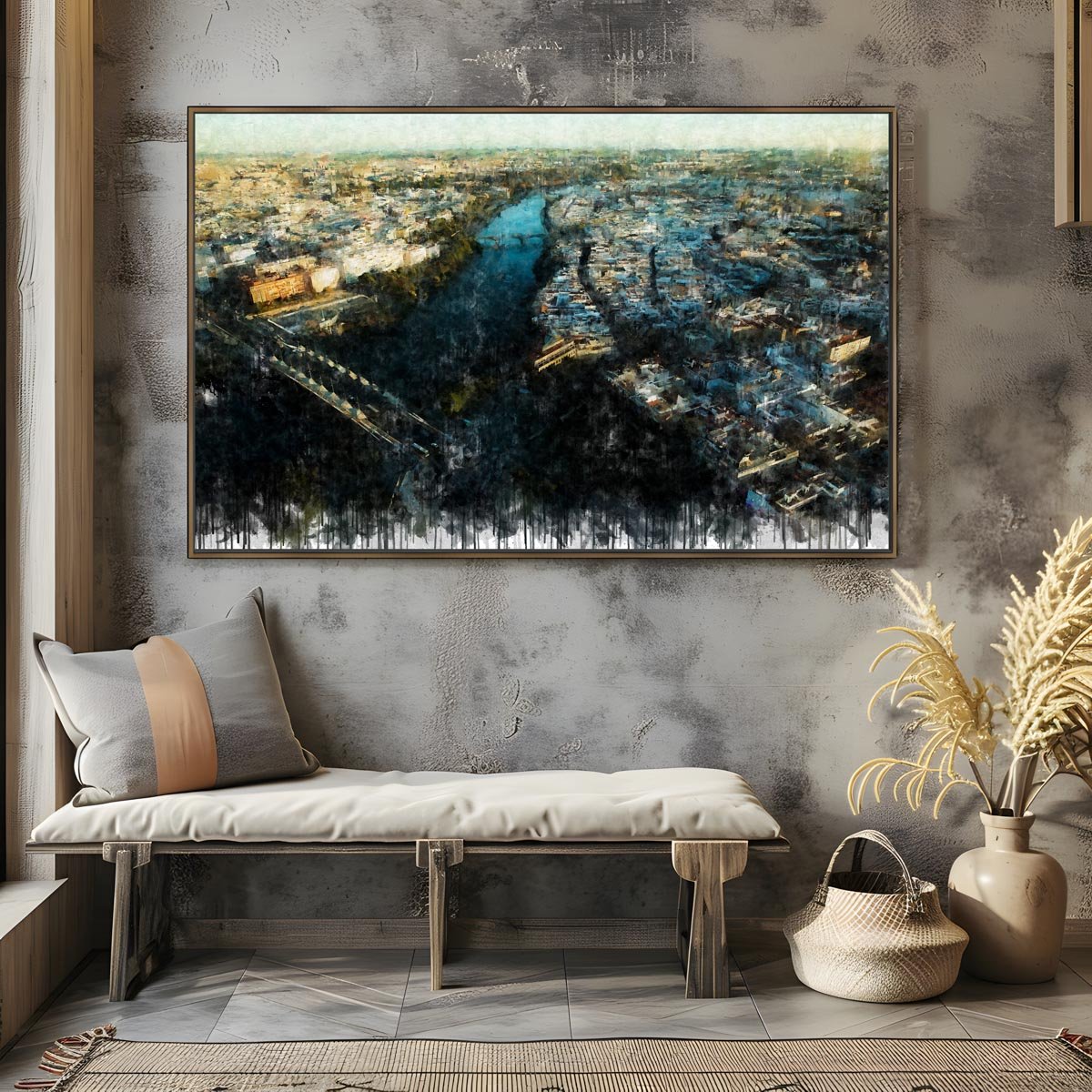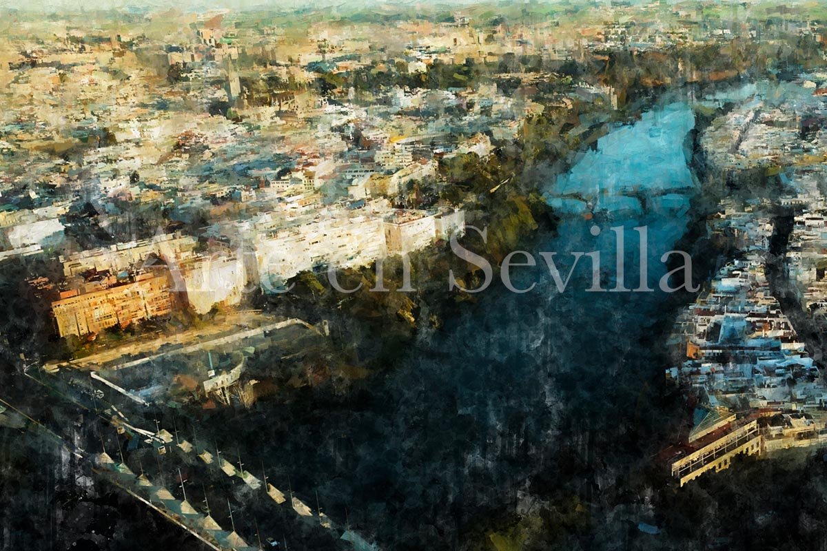 Uno de los rasgos más atractivos de este cuadro moderno de Sevilla es precisamente la sensación de amplitud que transmite. La vista elevada permite apreciar la densidad del paisaje urbano sevillano y descubrir la ciudad desde una mirada abierta, contemporánea y envolvente. El río actúa como una línea natural que aporta equilibrio visual y ordena toda la imagen con gran armonía.