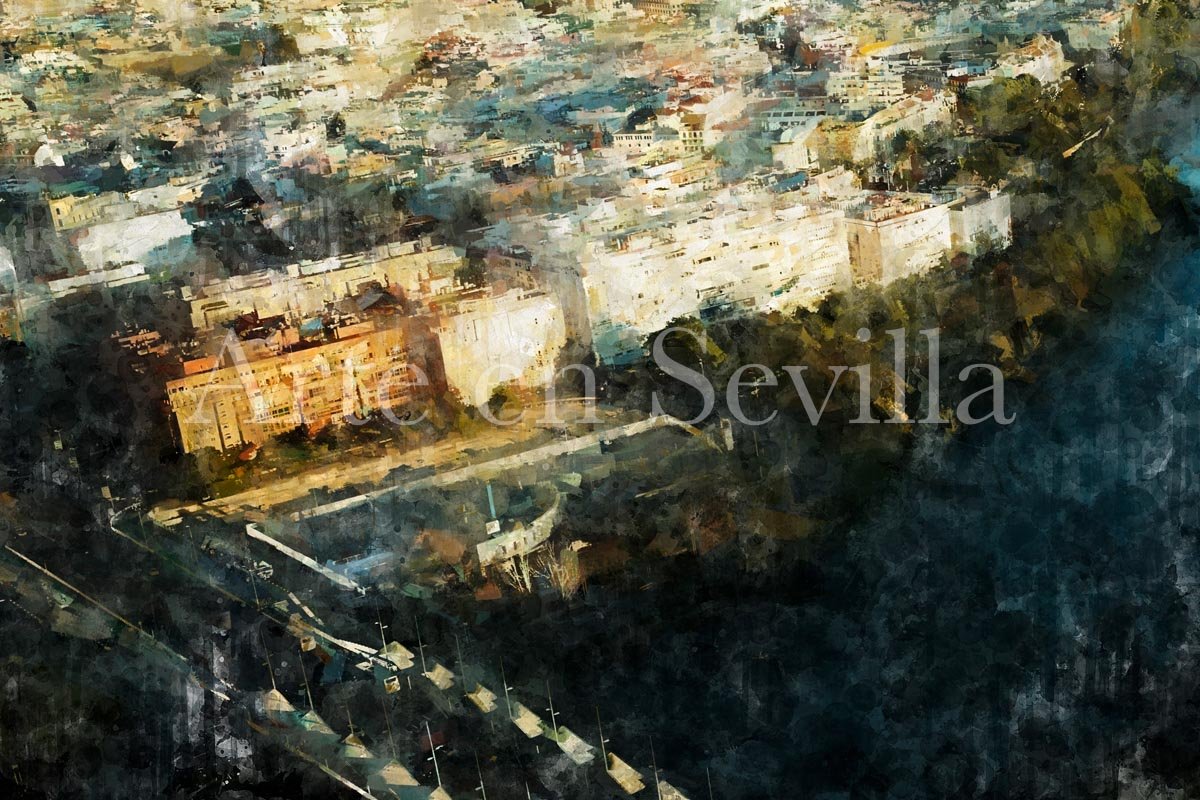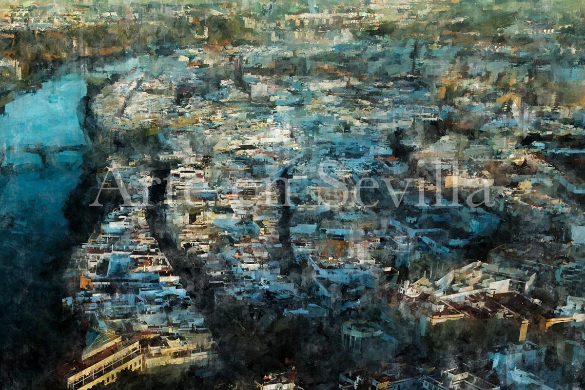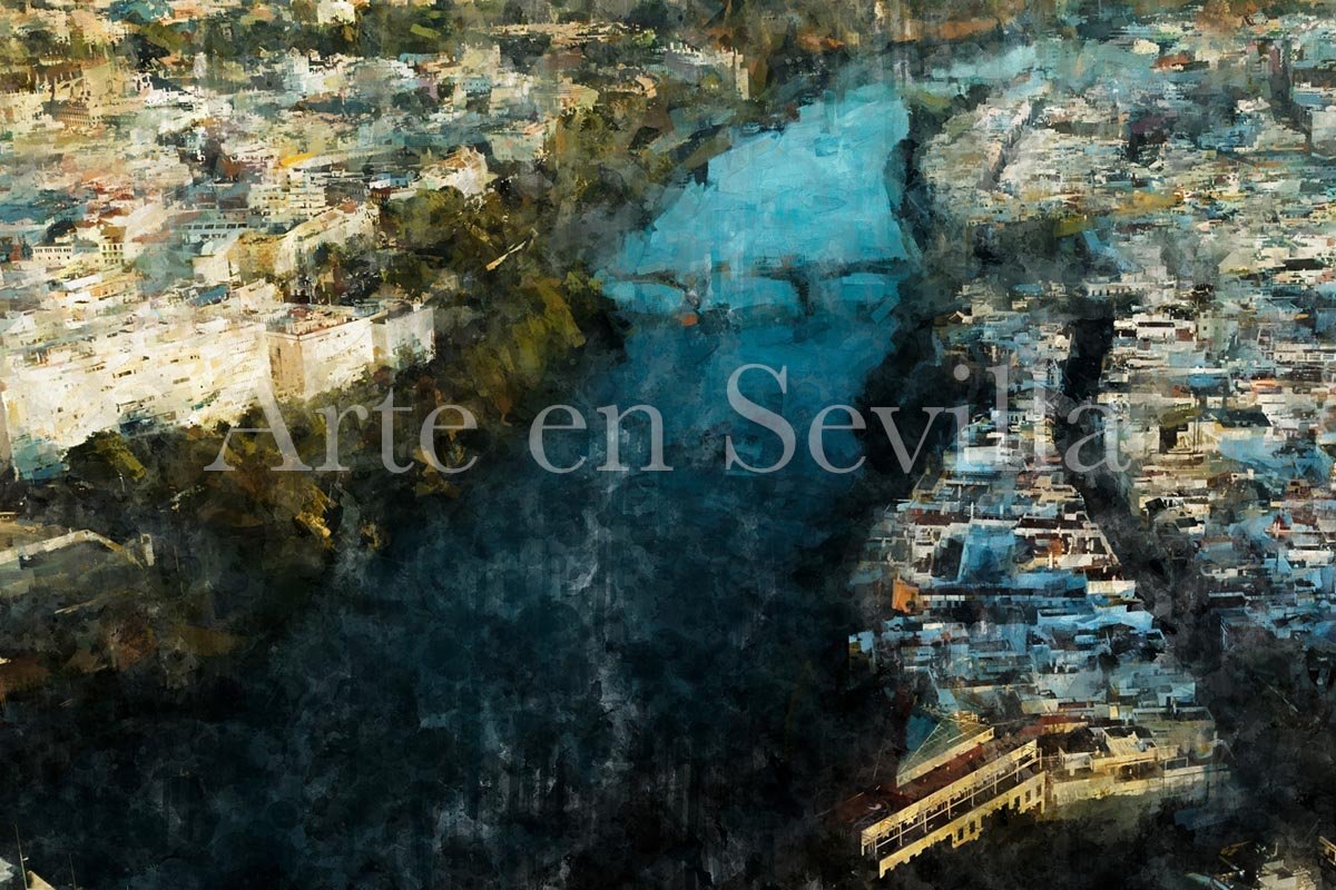 Sevilla desde la Torre Pelli es un cuadro moderno de Sevilla que muestra la ciudad desde una perspectiva espectacular, panorámica y poco habitual. La obra presenta una vista aérea en la que el río Guadalquivir se convierte en el gran eje central del paisaje urbano, separando las dos orillas mientras Sevilla se despliega hacia el horizonte con toda su complejidad y amplitud.